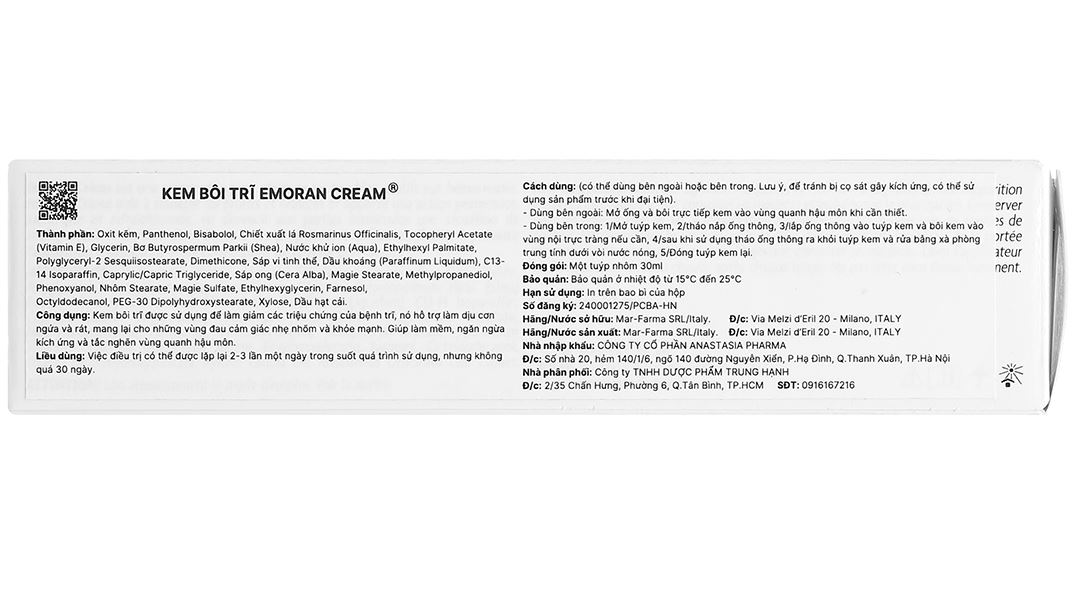 - Kem bôi Emoran được nghiên cứu và phát triển để giải quyết trực tiếp những vấn đề mà người bệnh trĩ gặp phải. Sản phẩm này giúp làm giảm ngay các triệu chứng ngứa ngáy, rát bỏng và đau đớn do bệnh trĩ gây ra. Thành phần như Bisabolol có tác dụng giảm viêm, làm dịu và bảo vệ vùng da bị tổn thương, giúp vùng hậu môn cảm thấy thoải mái và nhẹ nhõm hơn. Vitamin E và dầu hạt cải cung cấp độ ẩm và nuôi dưỡng làn da, giúp duy trì sự mềm mại, mịn màng và hạn chế tình trạng khô rát. Oxit kẽm, Panthenol, chiết xuất lá Rosmarinus Officinalis (Hương thảo) với khả năng chống viêm mạnh mẽ, các hoạt chất này giúp làm lành tổn thương, bảo vệ da khỏi sự kích ứng, đồng thời hỗ trợ phục hồi và tái tạo lớp da bị tổn thương tại vùng hậu môn.