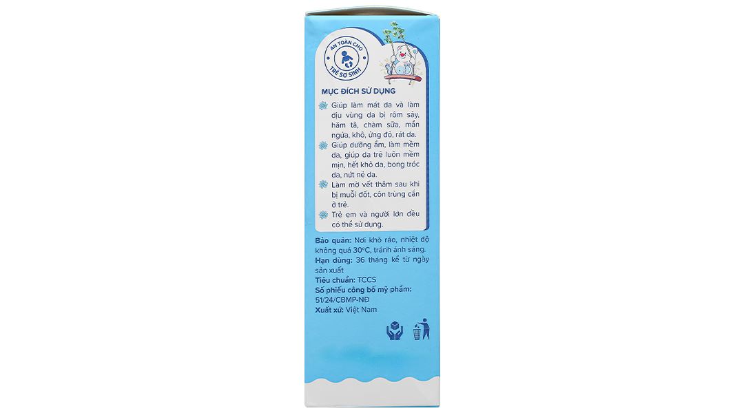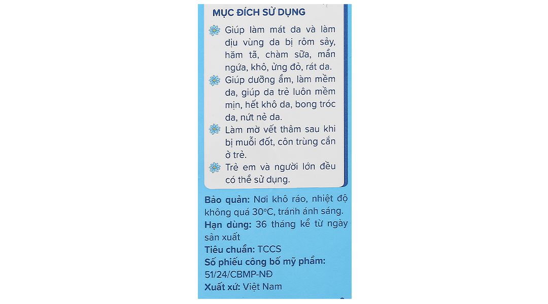 - Giúp làm mát da và làm dịu vùng da bị rôm sảy, hăm tã, chàm sữa, mẩn ngứa, khô, ửng đỏ, rát da.