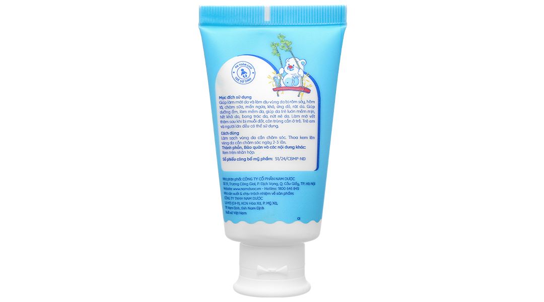 Zinc oxide, Matricaria chamomilla extract (Chiết xuất Cúc la mã), Centella asiatica extract (Chiết xuất Rau má), D-panthenol, DL-alpha Tocopheryl acetate (vitamin E), 5-ureidohydantoin (Allantoin), Glycerin, Cetyl Alcohol (and) Glyceryl Stearate (and) PEG-75 Stearate (and) Ceteth-20 (and) Steareth-20, Hydroxyethyl Acrylate/Sodium Acryloyldimethyl Taurate Copolymer, Potassium sorbate, Purified water.