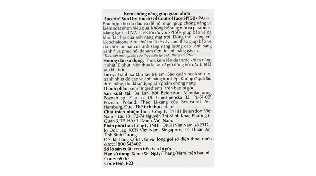 Kem chống nắng eucerin sun dry touch spf50+ pa+++ giúp giảm nhờn, phù hợp cho da dầu và dễ nổi mụn, giúp chống nắng và kiểm soát nhờn hiệu quả. Không bổ sung mùi và parabens. Màng lọc tia UVA, UVB tối ưu với SPF 50+, kem chống nắng Eucerin giúp bảo vệ da khỏi tác hại của ánh nắng mặt trời. Đồng thời, cùng với Licochalcone A từ chiết xuất rễ cây Cam Thảo giúp bảo vệ da khỏi tác hại của ánh sáng năng lượng cao và phục hồi da sạm đen do ánh nắng gây ra.