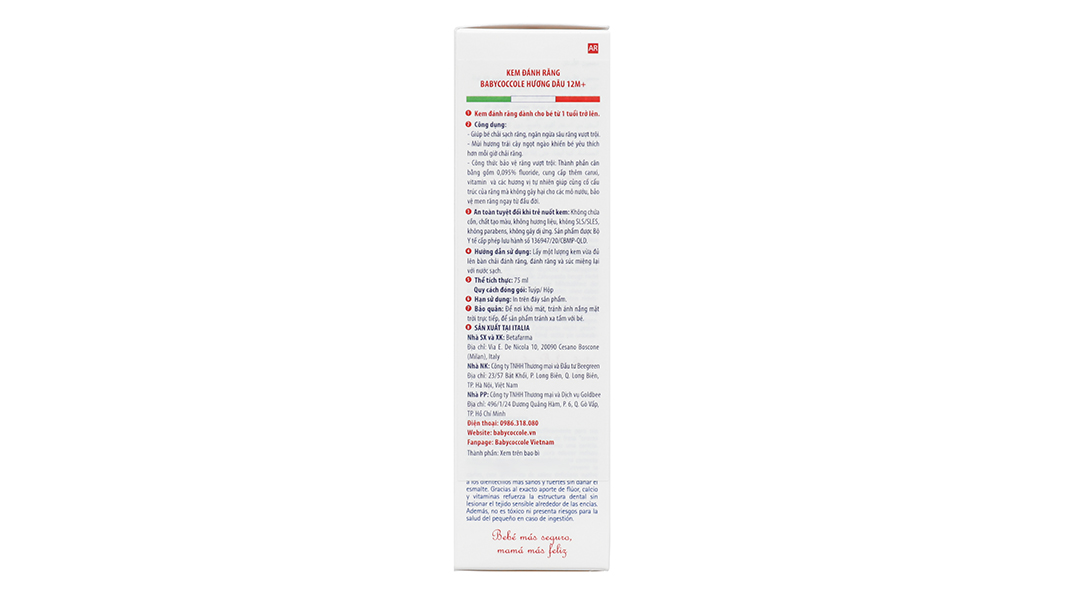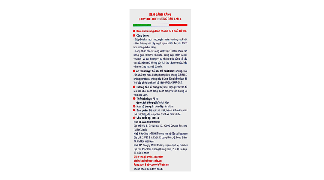 An toàn tuyệt đối khi trẻ nuốt kem: Không chứa cồn, chất tạo màu, không hương liệu, không SLS/SLES, không parabens, không gây dị ứng. Sản phẩm được Bộ Y Tế cấp phép lưu hành số 136947/20/CBMP-QLD.