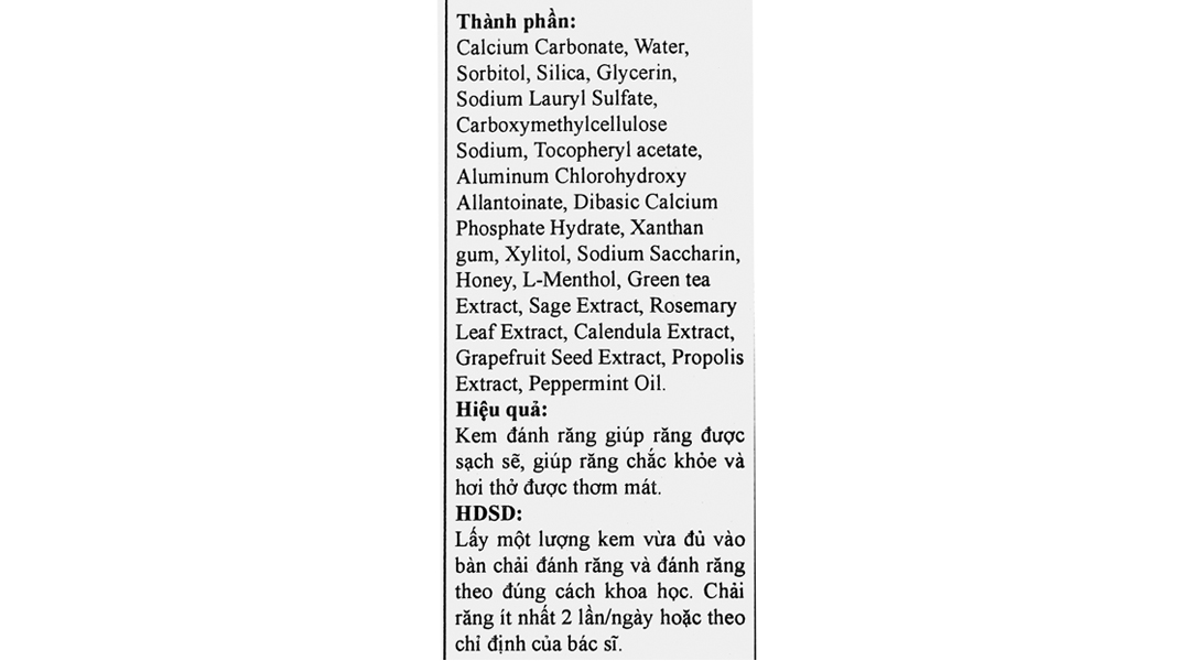 Thành phầnCalcium Carbonate, Water, Sorbitol, Silica, Glycerin, Sodium Lauryl Sulfate, Carboxymethylcellulose Sodium, Tocopheryl acetate, Aluminum Chlorohydroxy Allantoinate, Dibasic Calcium Phosphate Hydrate, Xanthan gum, Xylitol, Sodium Saccharin, Honey, L-Menthol, Green tea Extract, Sage Extract, Rosemary Leaf Extract, Calendula Extract, Grapefruit Seed Extract, Propolis Extract, Peppermint Oil.