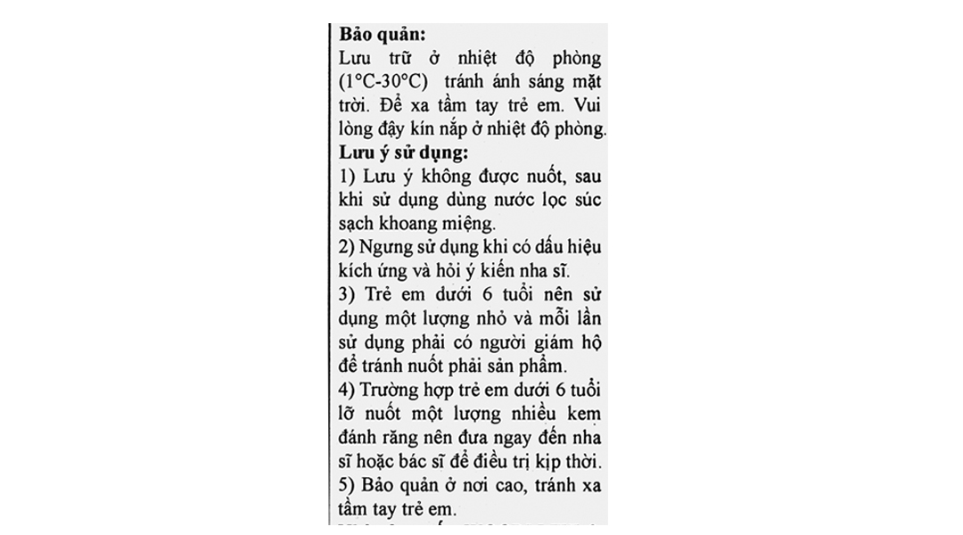 Lưu ý khi sử dụngKhông được nuốt, Để xa tầm tay trẻ em., Ngưng dùng khi bị kích ứng với sản phẩm.