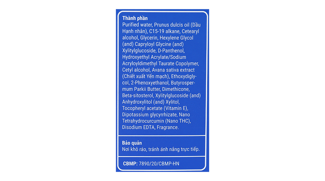 Purified water, Prunus dulcis oil (Dầu Hạnh nhân), C15-19 alkane, Cetearyl alcohol, Glycerin, Hexylene Glycol (and) Capryloyl Glycine (and) Xylitylglucoside, D-Panthenol, Hydroxyethyl Acrylate/Sodium Acryloyldimethyl Taurate Copolymer, Cetyl alcohol, Avana sativa extract (Chiết xuất Yến mạch), Ethoxydigly-col, 2-Phenoxyethanol, Butyrosper-Mum Parkii Butter, Dimethicone, Beta-sitosterol, Xylitylgucoside (and) Anhydroxylitol (and) Xylitol, Tocopheryl acetate (Vitamin E), Dipotassium glycyrrhizate, Nano Tetrahydrocurcumin (Nano THC), Disodium EDTA, Fragrance.