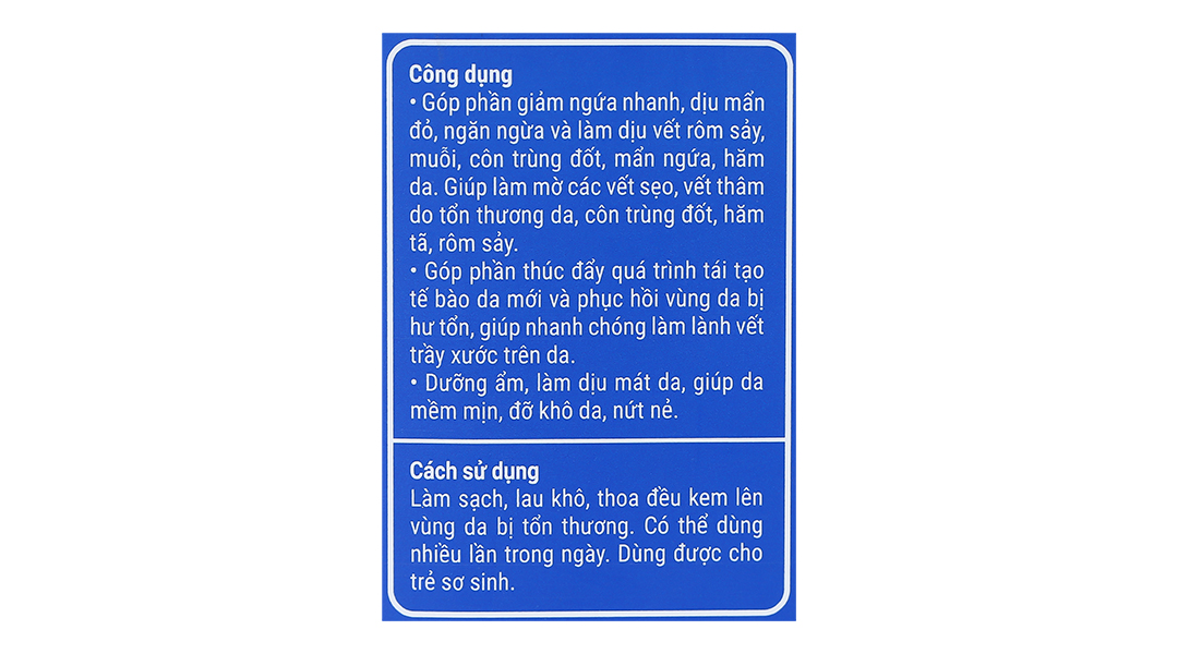 Góp phần giảm ngứa nhanh, dịu mẩn đỏ, ngăn ngừa và làm dịu vết rôm sảy, muỗi, côn trùng đốt, mẫn ngứa, hăm tã, rôm sảy.