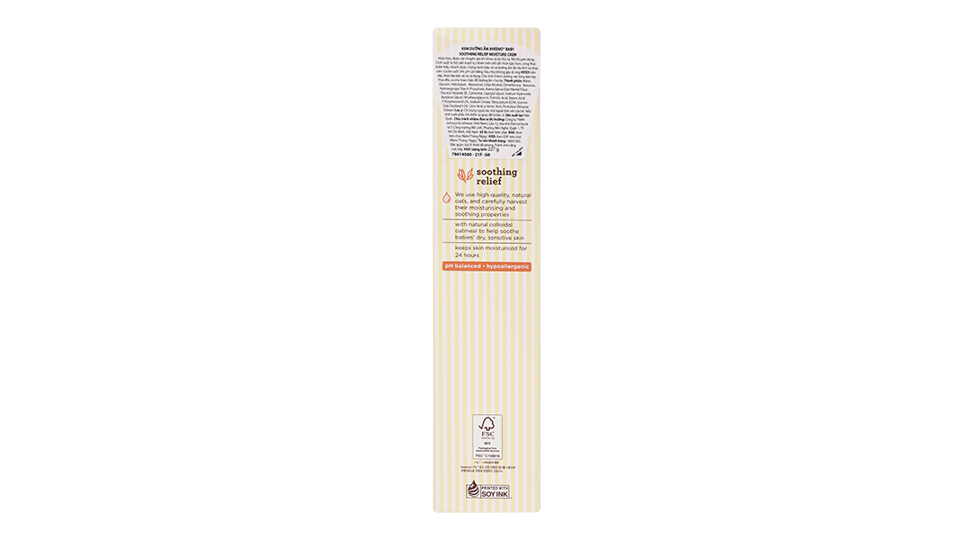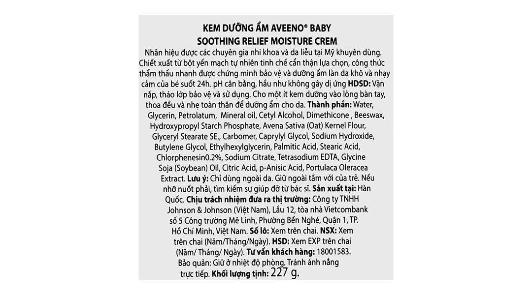 Thành phần chínhWater, Glycerin, Petrolatum, Mineral oil, Cetyl Alcohol, Dimethicone, Beeswax, Hydroxypropyl Starch Phosphate, Avena Sativa (Oat) Kernel Flour, Glyceryl Stearate SE., Carbomer, Caprylyl Glycol, Sodium Hydroxide, Butylene Glycol, Ethylhexylglycerin, Palmitic Acid, Stearic Acid, Chlorphenesin0.2%, Sodium Citrate, Tetrasodium EDTA, Glycine Soja (Soybean) Oil, Citric Acid, p-Anisic Acid, Portulaca Oleracea Extract.