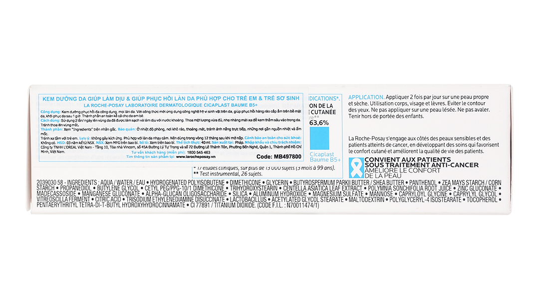 Thành phần chínhAqua/Water/Eau, Hydrogenated Polyisobutene, Dimethicone, Glycerin, Butyrospermum Parkii Butter/Shea Butter, Panthenol, Zea Mays Starch/Corn Starch, Propanediol, Butylene Glycol, Cetyl Peg/Ppg-10/1 Dimethicone, Trihydroxystearin, Centella Asiatica Leaf Extract, Polymnia Sonchifolia Root Juice, Zinc Gluconate, Madecassoside, Manganese Gluconate, Alpha-Glucan Oligosaccharide, Silica, Aluminum Hydroxide, Magnesium Sulfate, Mannose, Capryloyl Glycine, Caprylyl Glycol, Vitreoscilla Ferment, Citric Acid, Trisodium Ethylenediamine Disuccinate, Lactobacillus, Acetylated Glycol Stearate, Maltodextrin, Polyglyceryl-4 Isostearate, Tocopherol, Pentaerythrityl Tetra-Di-T-Butyl Hydroxyhydrocinnamate, Cl 77891/Titanium Dioxide.