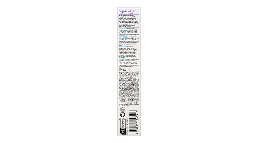 - Ngăn ngừa và giảm tình trạng tăng sắc tố: Với Melasyl, một hoạt chất độc đáo được nghiên cứu trong suốt 18 năm và được cấp nhiều bằng sáng chế, sản phẩm giúp ngăn chặn việc sản xuất melanin dư thừa trước khi các đốm đen có thể hình thành.