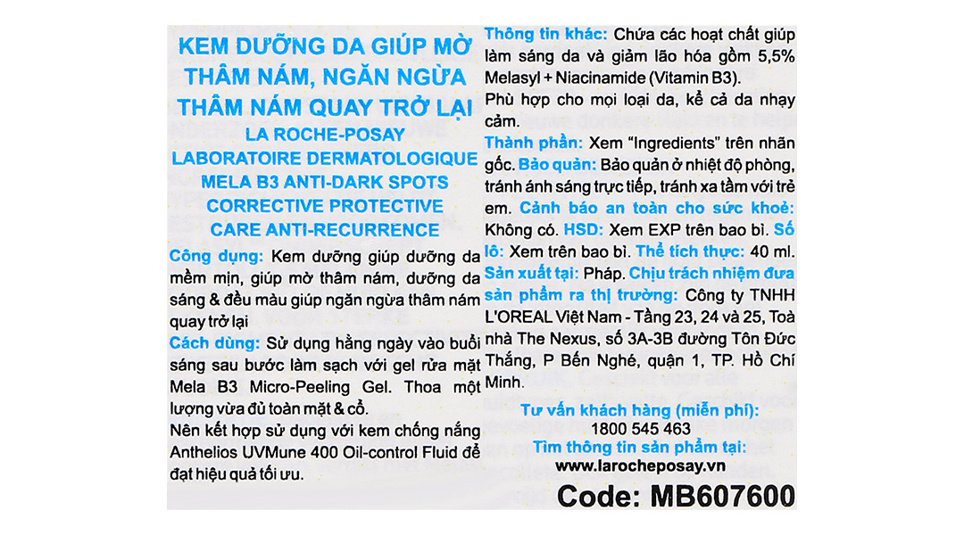 Với công thức đột phá và những lợi ích vượt trội, kem dưỡng La Roche-Posay Mela B3 chính là bí quyết để bạn có được làn da sáng đều màu, không còn thâm nám, tự tin tỏa sáng mỗi ngày.