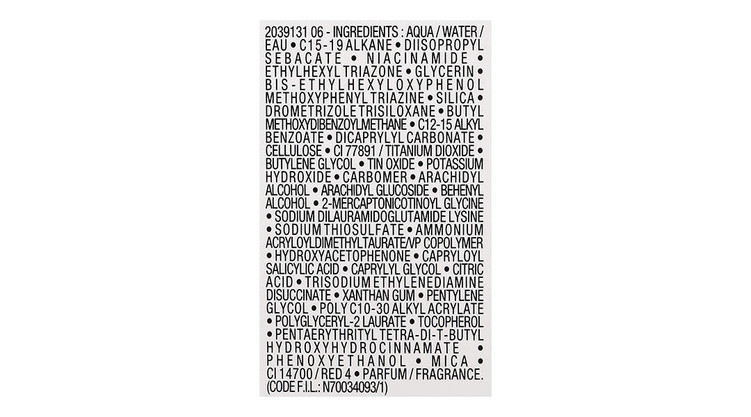 Aqua/Water/Eau, C15-19 Alkane, Diisopropyl Sebacate, Niacinamide, Ethylhexyl Triazone, Glycerin, Bis-Ethylhexyloxyphenol Methoxyphenyl Triazine, Silica, Drometrizole Trisiloxane, Butyl Methoxydibenzoylmethane, C12-15 Alkyl Benzoate, Dicaprylyl Carbonate, Cellulose, Ci 77891/Titanium Dioxide, Butylene Glycol, Tin Oxide, Potassium Hydroxide, Carbomer, Arachidyl Alcohol, Arachidyl Glucoside, Behenyl Alcohol, 2-Mercaptonicotinoyl Glycine, Sodium Dilauramidoglutamide Lysine, Sodium Thiosulfate, Ammonium Acryloyldimethyltaurate/VP Copolymer, Hydroxyacetophenone, Capryloyl Salicylic Acid, Caprylyl Glycol, Citric Acid, Trisodium Ethylenediamine Disuccinate, Xanthan Gum, Pentylene Glycol, Poly C10-30 Alkyl Acrylate, Polyglyceryl-2 Laurate, Tocopherol, Pentaerythrityl Tetra-Di-T-Butyl Hydroxyhydrocinnamate, Phenoxyethanol, Mica, Ci 14700/Red 4, Parfum/Fragrance. (CODE F.I.L.: N70034093/1).