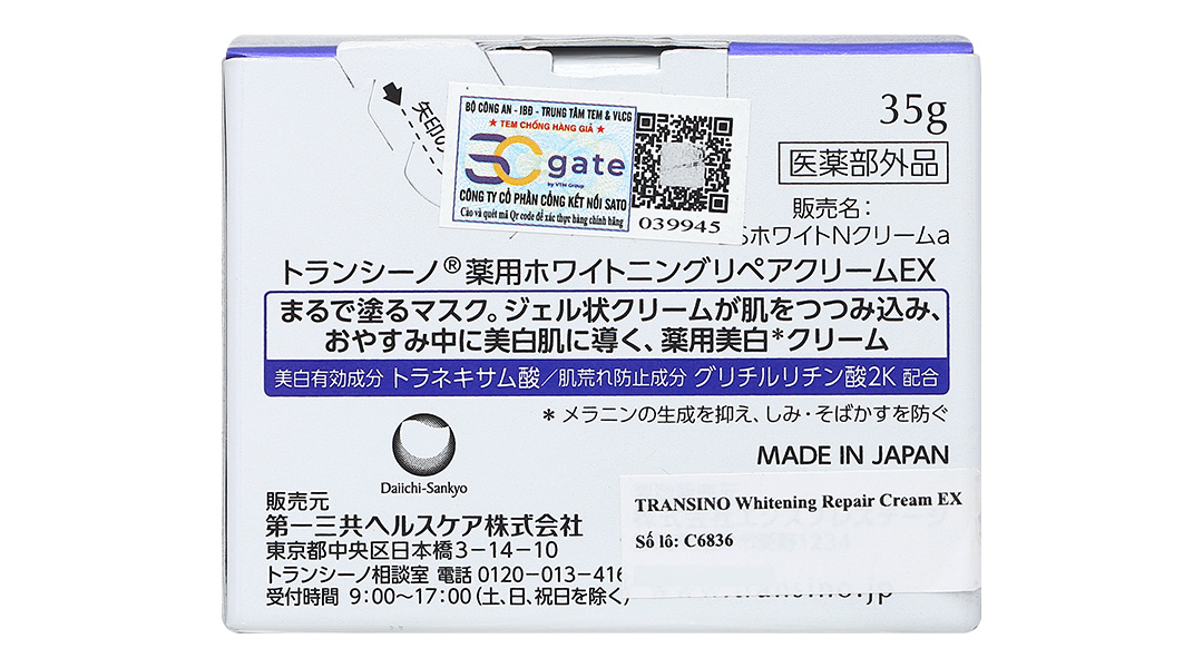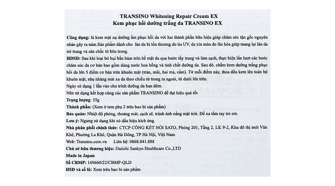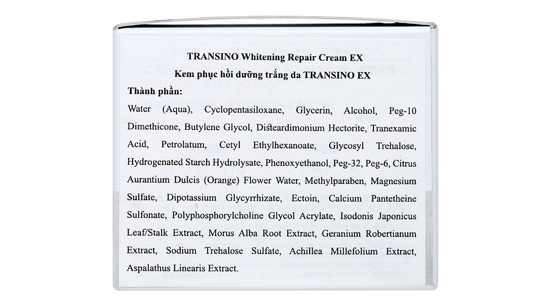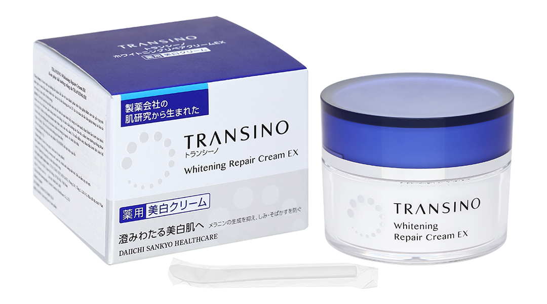 Kem dưỡng trắng da Transino Whitening Repair Cream EX là kem mặt nạ dưỡng ẩm phục hồi da với hai thành phần hữu hiệu giúp chăm sóc tận gốc nguyên nhân gây ra nám. Sản phẩm dành cho làn da bị tổn thương do tia UV, da xỉn màu do lão hóa giúp mang lại làn da trẻ trung và săn chắc từ bên trong.