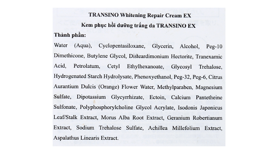Water (Aqua), Cyclopentasiloxane, Glycerin, Alcohol, Peg-10 Dimethicone, Butylene Glycol, Disteardimonium Hectorite, Tranexamic Acid, Petrolatum, Cetyl Ethylhexanoate, Glycosyl Trehalose, Hydrogenated Starch Hydrolysate, Phenoxyethanol, Peg-32, Peg-6, Citrus Aurantium Dulcis (Orange) Flower Water, Methylparaben, Magnesium Sulfate, Dipotassium Glycyrrhizate, Ectoin, Calcium Pantetheine Sulfonate, Polyphosphorylcholine Glycol Acrylate, Isodonis Japonicus Leaf/Stalk Extract, Morus Alba Root Extract, Geranium Robertianum Extract, Sodium Trehalose Sulfate, Achillea Millefolium Extract, Aspalathus Linearis Extract.