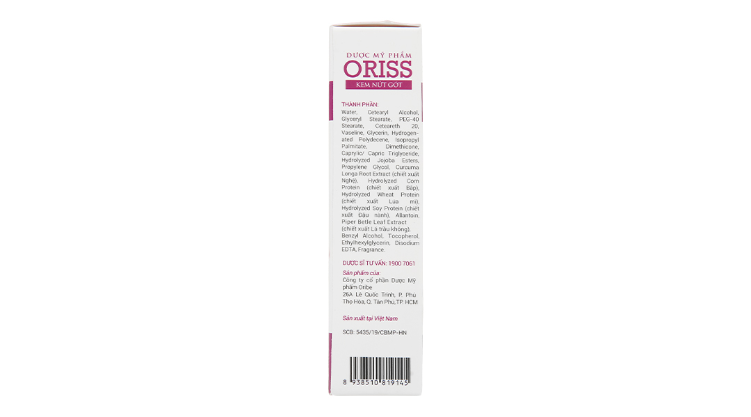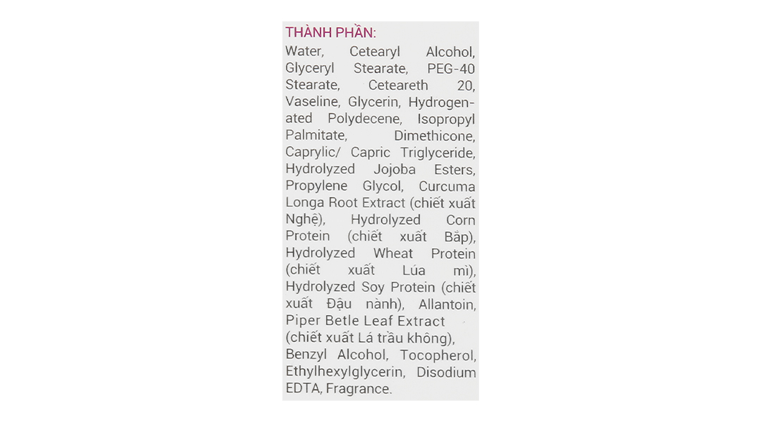 Water, Cetearyl Alcohol, Glyceryl Stearate, PEG-40 Stearate, Ceteareth 20, Vaseline, Glycerin, Hydrogenated Polydecene, Isopropyl Palmitate, Dimethicone, Caprylic/Capric Triglyceride, Hydrolyzed Jojoba Esters, Propylene Glycol, Curcuma Longa Root Extract (Chiết xuất nghệ), Hydrolyzed Corn Protein (Chiết xuất Bắp), Hydrolyzed Wheat Protein (Chiết xuất Lúa mì), Hydrolyzed Soy Protein (Chiết xuất Đậu nành), Allantoin, Piper Betle Leaf Extract (Chiết xuất Lá trầu không), Benzyl Alcohol, Tocopherol, Ethylhexylglycerin, Disodium EDTA, Fragrance.