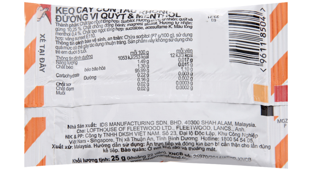 Chất chống đóng bánh: magnesi stearat. Hương tự nhiên: menthol 0.4%. Chất tạo ngọt tổng hợp: sucralose, acesulfame K. Màu tổng hợp: vàng sunset E110.