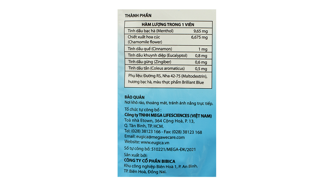 Hoạt chấtTinh dầu bạc hà, Tinh dầu gừng, Tinh dầu quế, Chiết xuất hoa cúc, Tinh dầu tràm, Tinh dầu tần