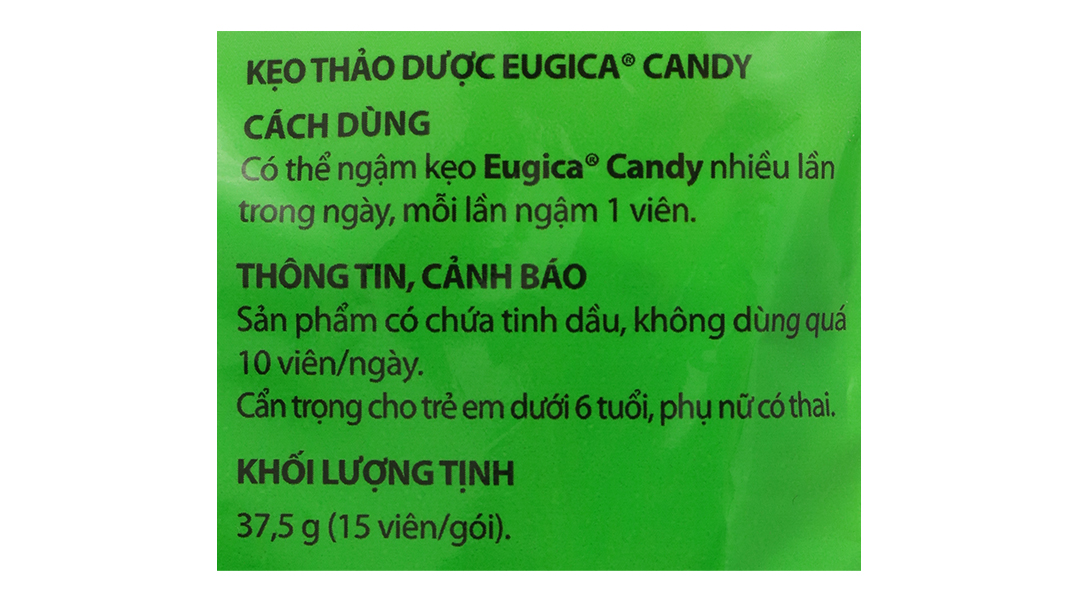 Có thể ngậm kẹo Eugica Candy nhiều lần trong ngày, mỗi lần ngậm 1 viên. Tối đa 10 viên/ngày.