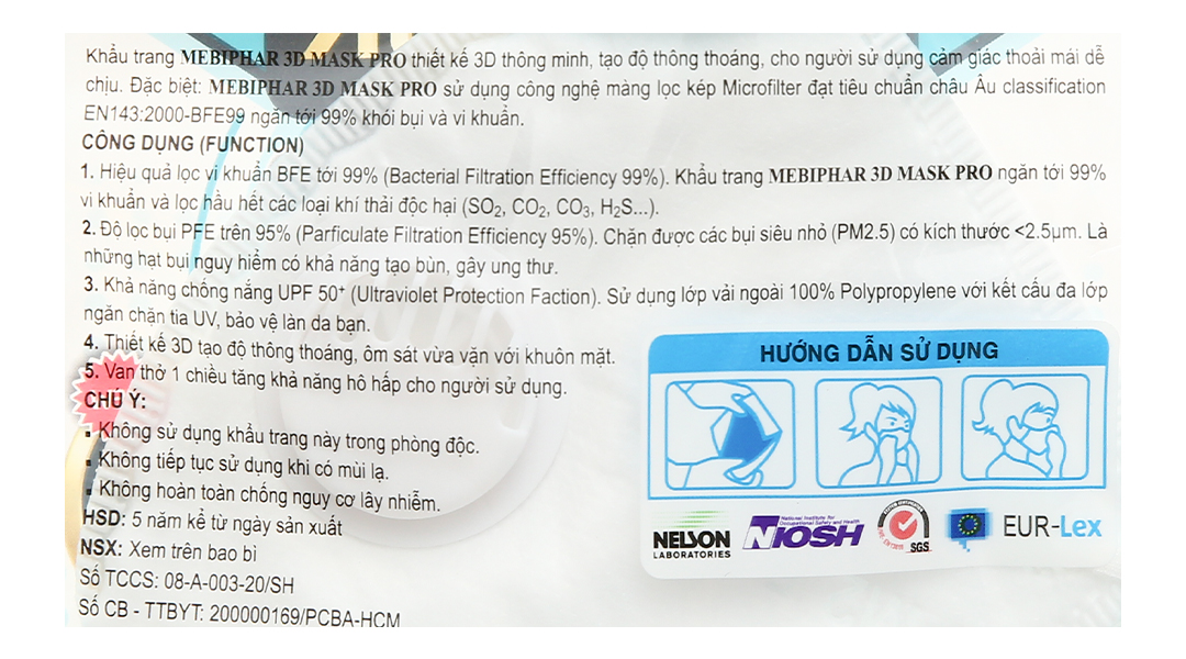 Hiệu quả lọc vi khuẩn BFE tới 99%. Sản phẩm có khả năng ngăn tới 99% vi khuẩn và lọc hầu hết các loại khí thải độc hại (SO2, CO2, CO3, H2S,…).