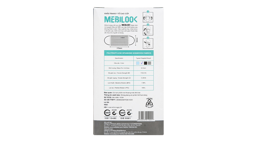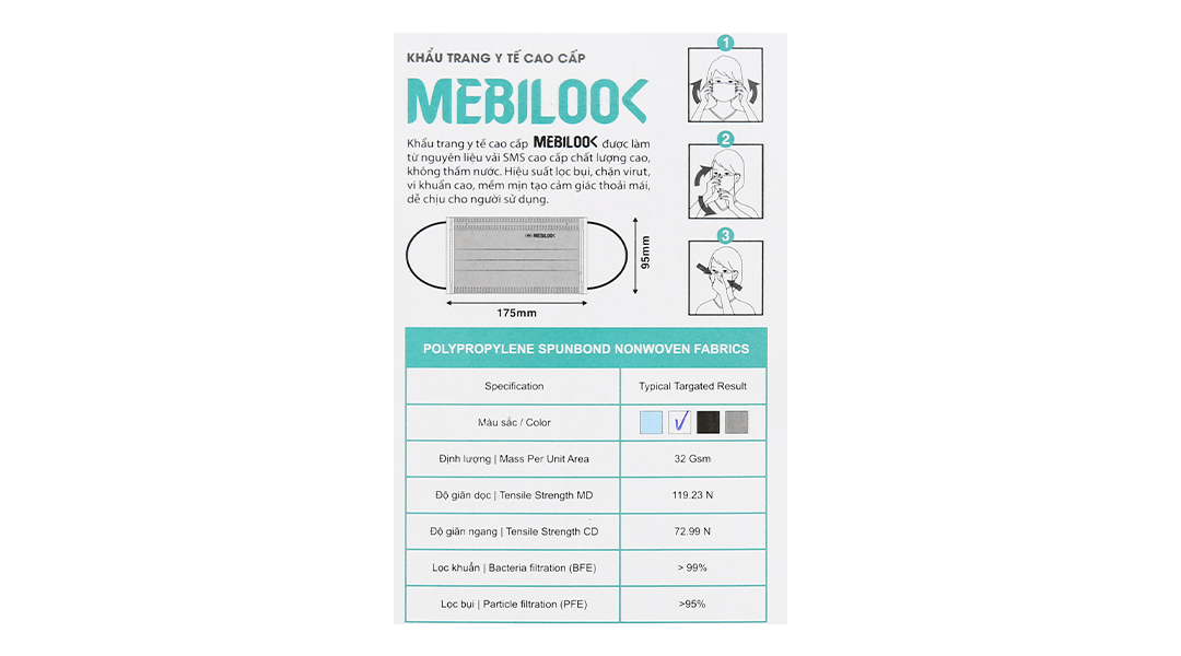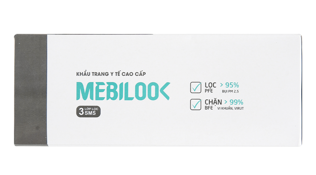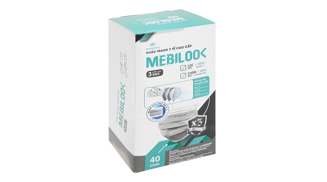 Khẩu trang là thiết bị, dụng cụ y tế không thể thiếu hiện nay. Trên thị trường cho ra rất nhiều dòng khẩu trang từ bình dân đến cao cấp, và hãng khẩu trang Mebiphar đã cho ra sản phẩm khẩu trang y tế Mebilook 3 lớp màu trắng, được làm từ nguyên liệu vải SMS cao cấp chất lượng cao, không thấm nước. Hiệu suất lọc bụi, chặn virus, vi khuẩn cao, mềm mịn tạo cảm giác thoải mái, dễ chịu cho người sử dụng. Khẩu trang gồm 3 lớp giúp bạn ngăn chặn hiệu quả bụi khuẩn, không khí ô nhiễm, ngăn chặn các bệnh lây truyền qua đường hô hấp.
