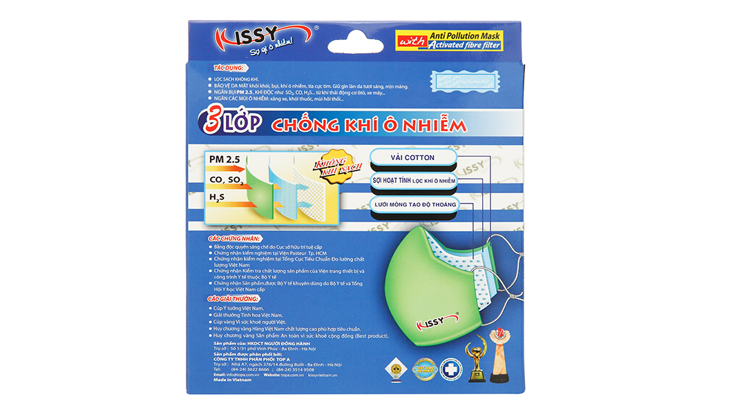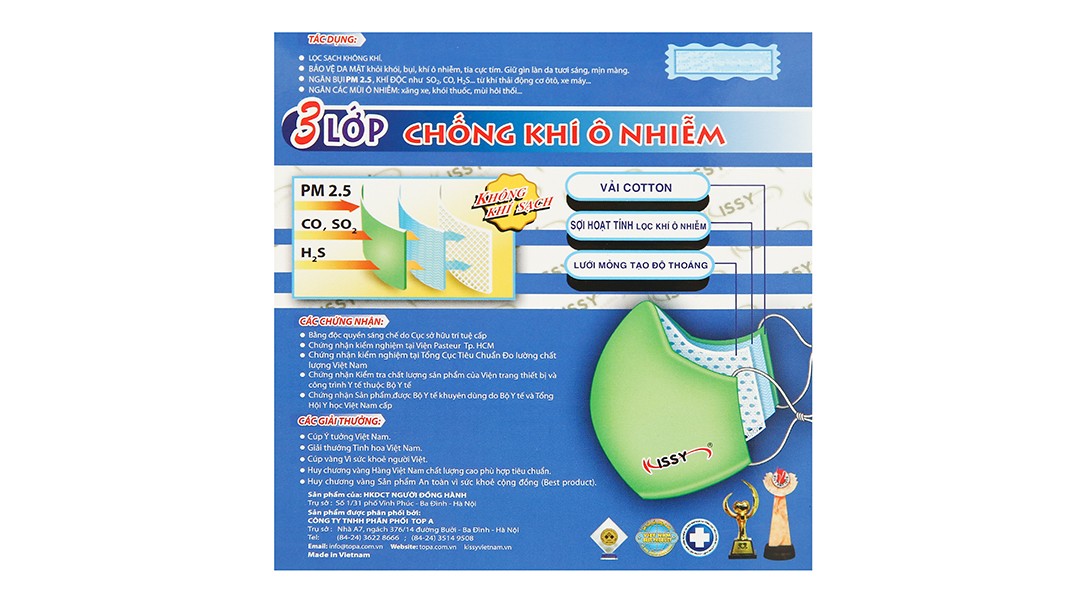 Cấu trúc 3 lớp: Ngoài cùng là vải cotton, lớp giữa là sợi hoạt tính có tác dụng lọc khí, lớp trong cùng là lưới mỏng có tác dụng tạo độ thoáng khí.