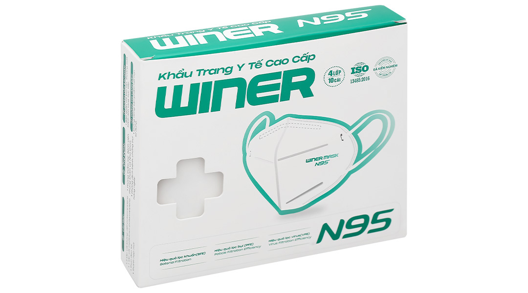 Khẩu trang y tế Winer N95 4 lớp màu trắng là sản phẩm khẩu trang y tế cao cấp không sử dụng sợi thuỷ tinh, không gây kích ứng, cản lực thở khí thấp, công suất lọc cao, kháng khuẩn.