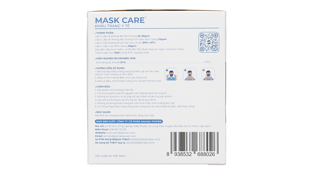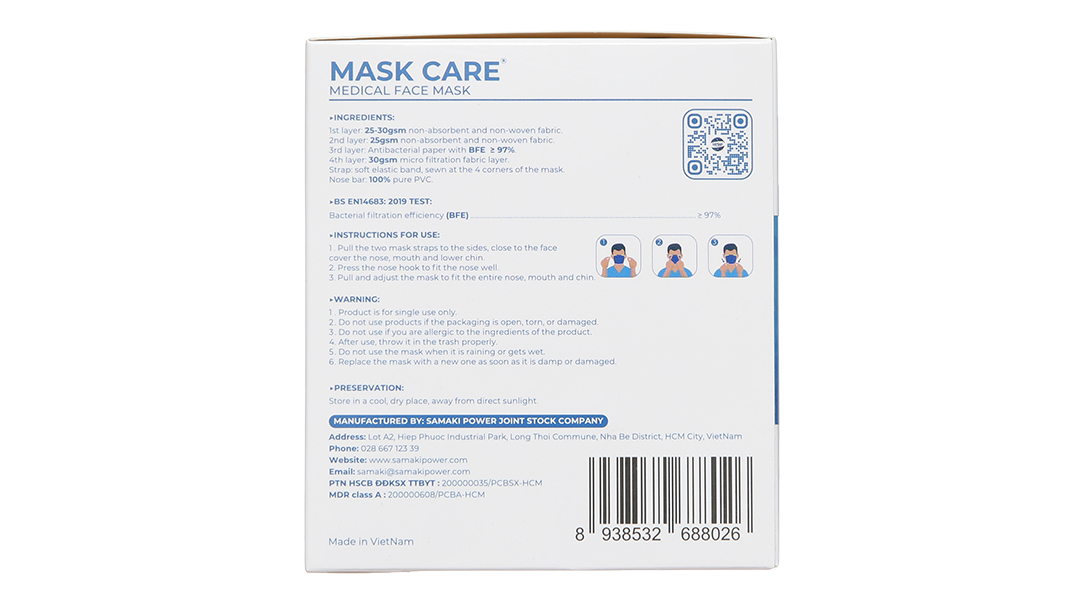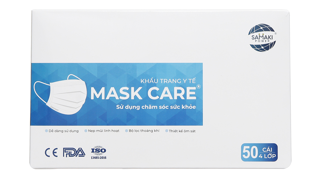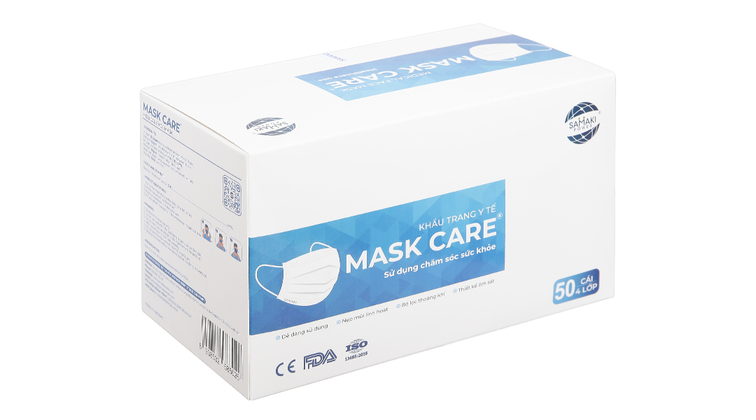 Khẩu trang y tế Mask Care 4 lớp màu trắng là sản phẩm thuộc thương hiệu Samaki Power- doanh nghiệp hàng đầu chuyên về sản xuất và phân phối các dòng khẩu trang y tế chất lượng cao.