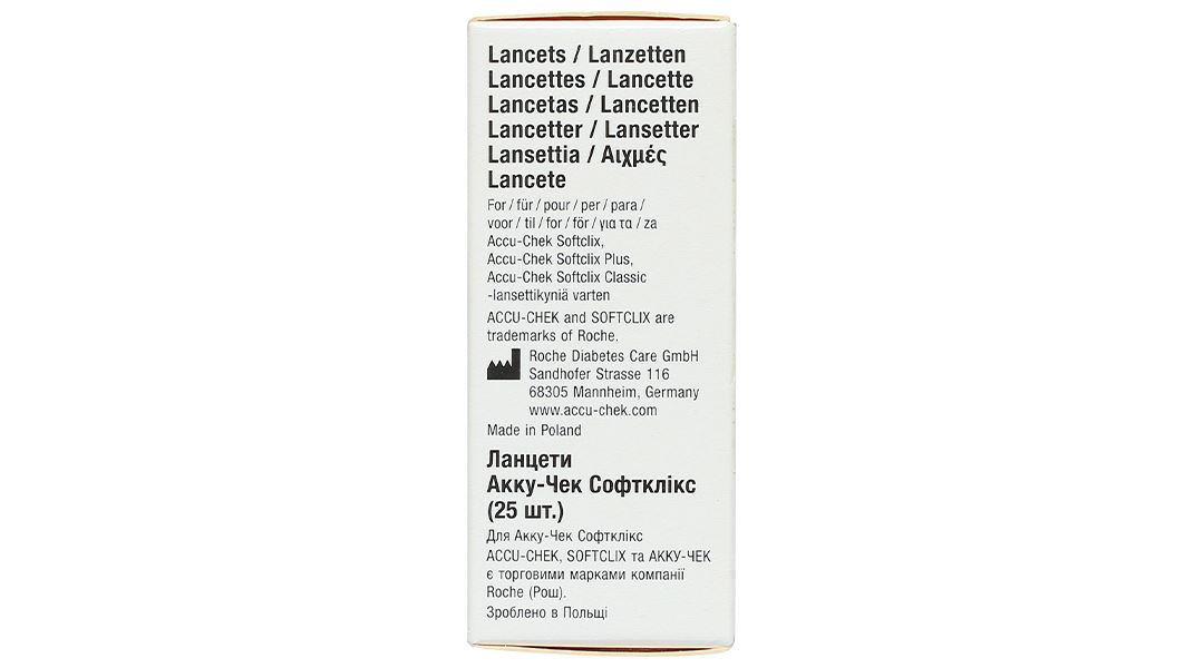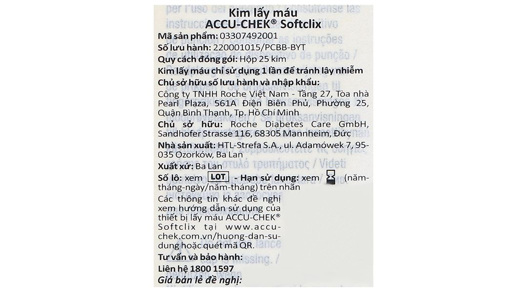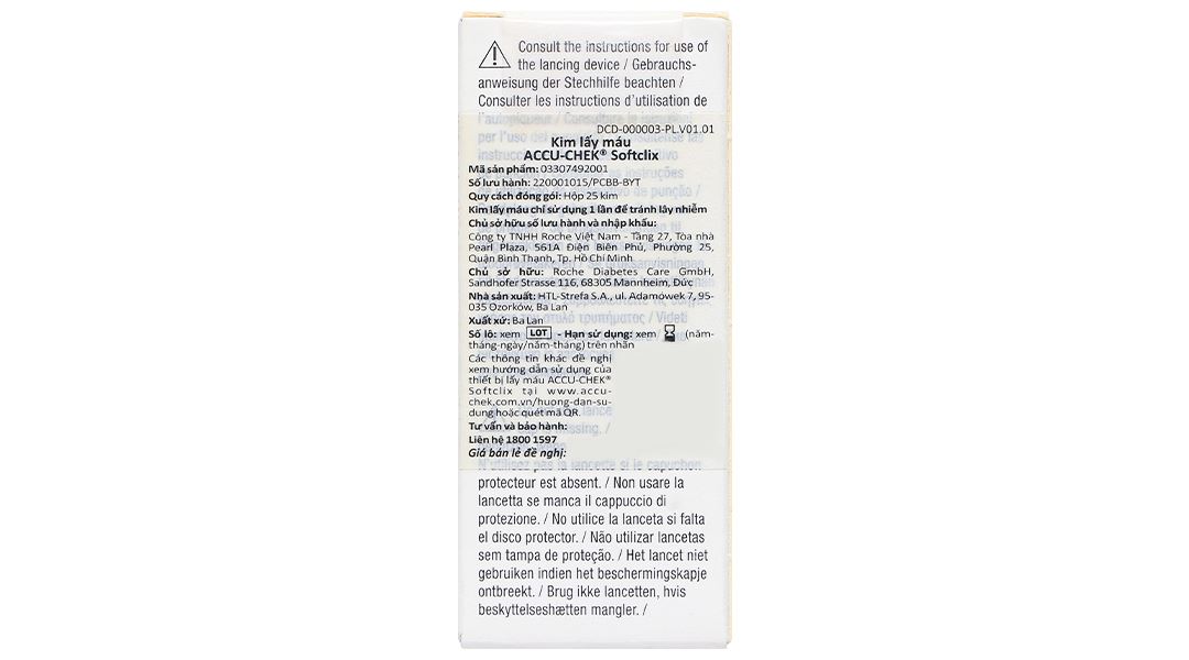 Kim Accuchek Softclix được sản xuất tại Ba Lan theo tiêu chuẩn chất lượng của hãng ROCHE của Đức, phù hợp cho bút lấy máu kèm theo trong các dòng máy đo đường huyết của Accucheck như: Accucheck Active; Accucheck Performa; Accuchek Advantage.