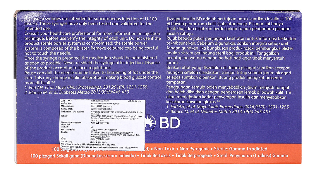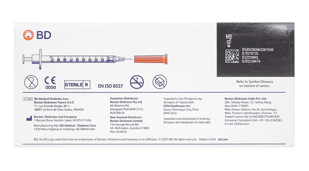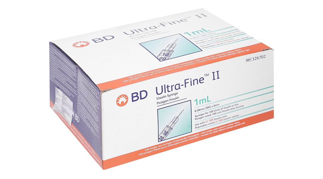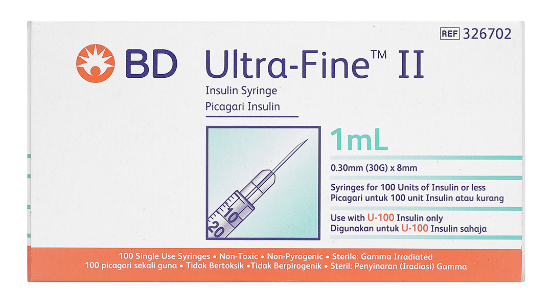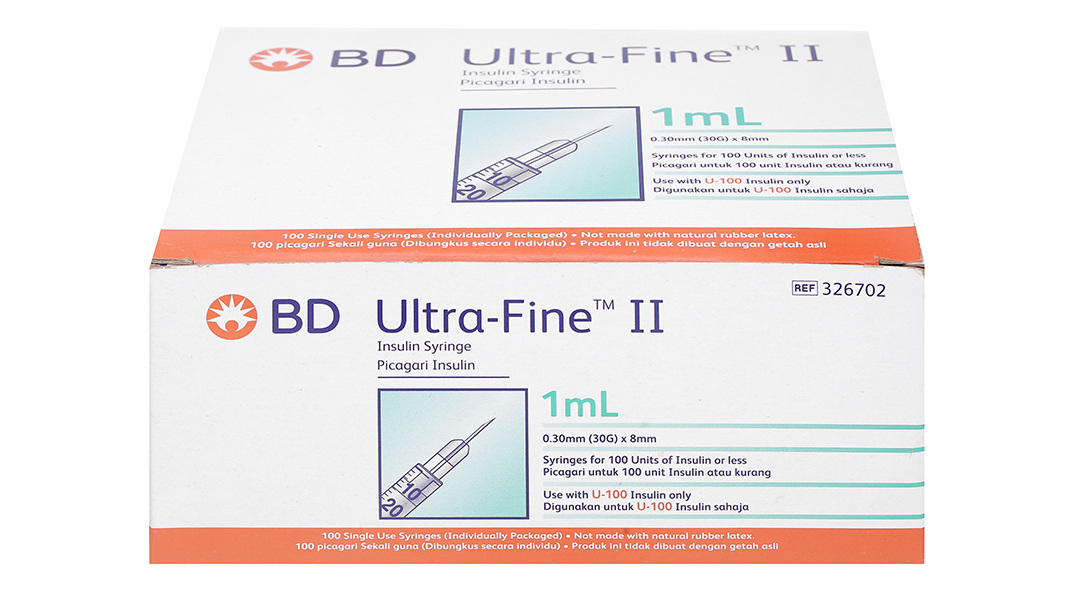 - Bơm tiêm Insulin Ultra-Fine™ 8mm, 1.0cc, 30G cung cấp chính xác liều của insulin cho bệnh nhân tiểu đường, được thiết kế với vật liệu thép phẫu thuật và công nghệ mạ Micro – bonded.