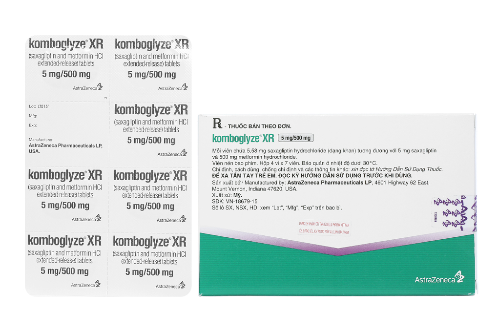 – Viên KOMBOGLYZE XR 5mg/500mg có chứa 5mg saxagliptin và 500mg metformin HCl phóng thích kéo dài.