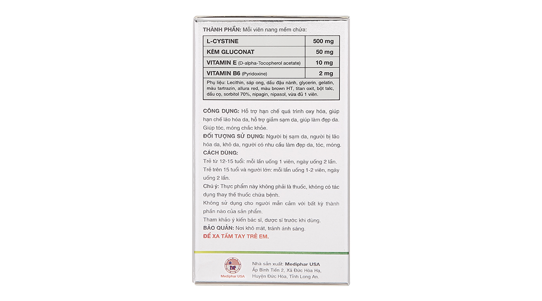 Với thành phần chính L-Cystine, là một amino acid quan trọng, đóng vai trò chính trong việc hình thành và duy trì sự chắc khỏe của da, tóc và móng. Khi cơ thể được cung cấp đủ L-Cystine, các sợi collagen trong da được tái tạo và củng cố, giúp da luôn căng mịn, đàn hồi và khỏe mạnh. L-Cystine cũng giúp tăng cường sự phát triển của tóc, giảm tình trạng tóc gãy rụng, mang lại mái tóc bóng mượt và dày dặn. Đồng thời, L-Cystine còn có tác dụng bảo vệ da khỏi tác động của các gốc tự do, ngăn ngừa sự lão hóa sớm và giữ cho làn da luôn sáng mịn.