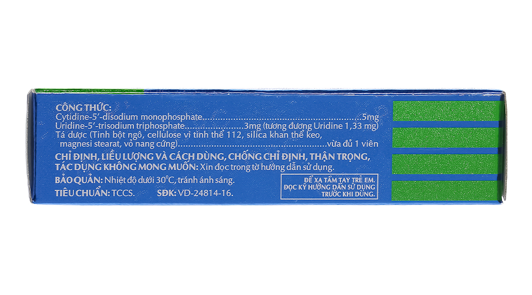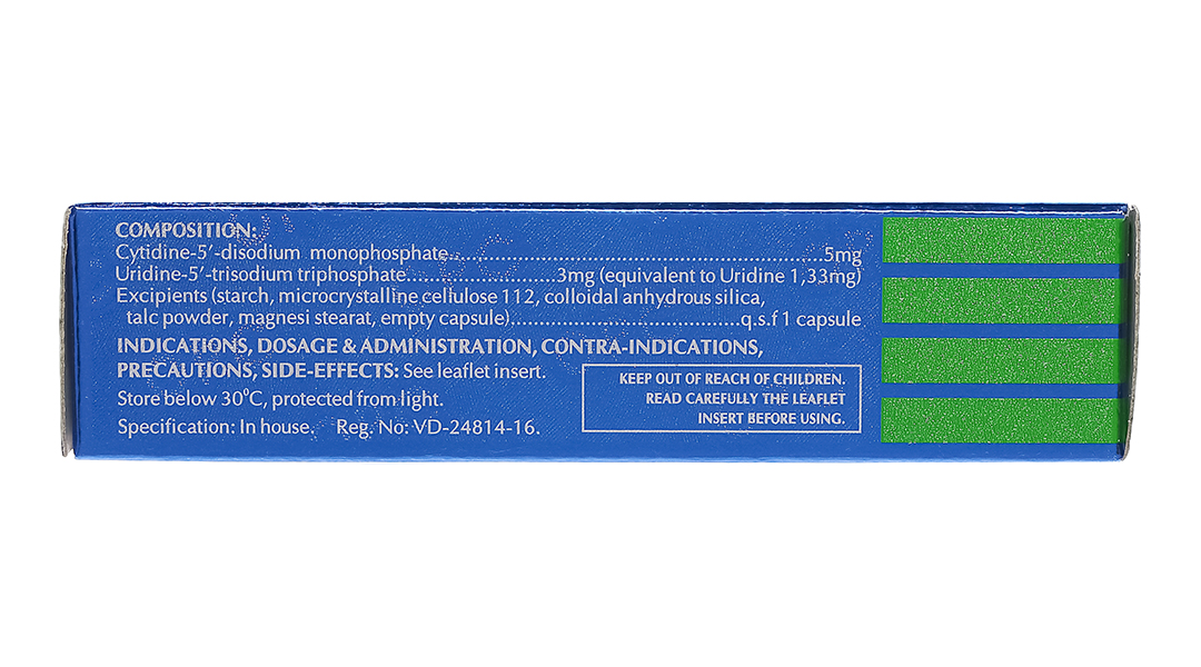 – Hoạt chất: Cytidine -5’-disodium monophosphate 5mg; Uridine-5′-trisodium triphosphate 3mg (tương đương Uridine 1.33mg).