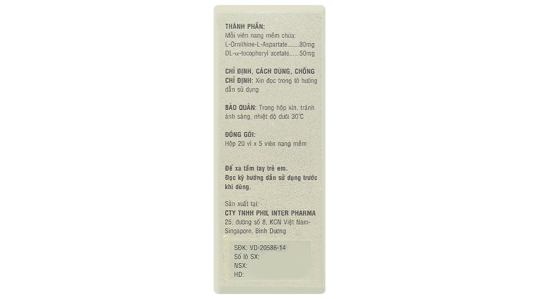 - Tá dược: Dầu tỏi, Dầu đậu nành, Dầu Lecithin, Dầu cọ, Sáp ong trắng, Dầu hoa anh thảo, Gelatin, Glycerin đậm đặc, Ethyl vanillin, Titan dioxide, Màu đỏ số 40, Màu xanh số 1, Nước tinh khiết.