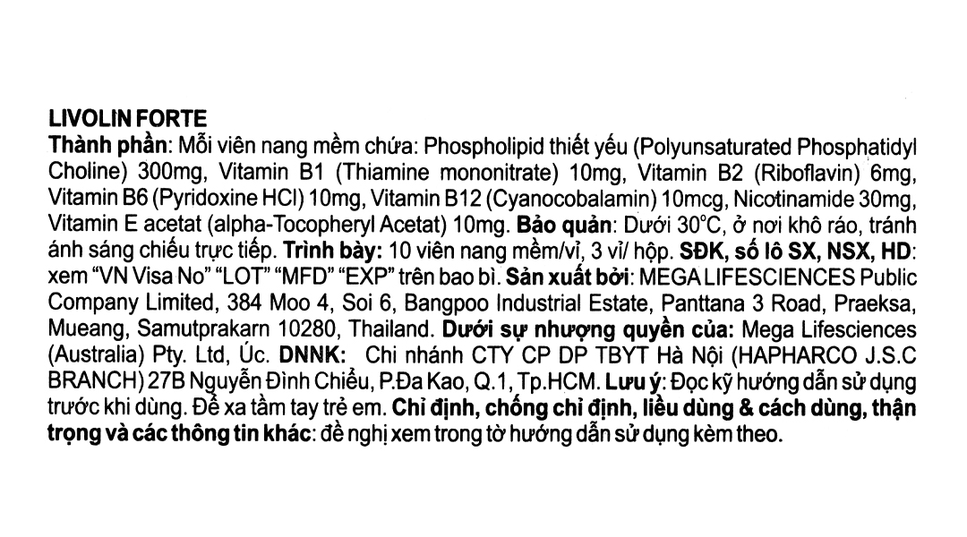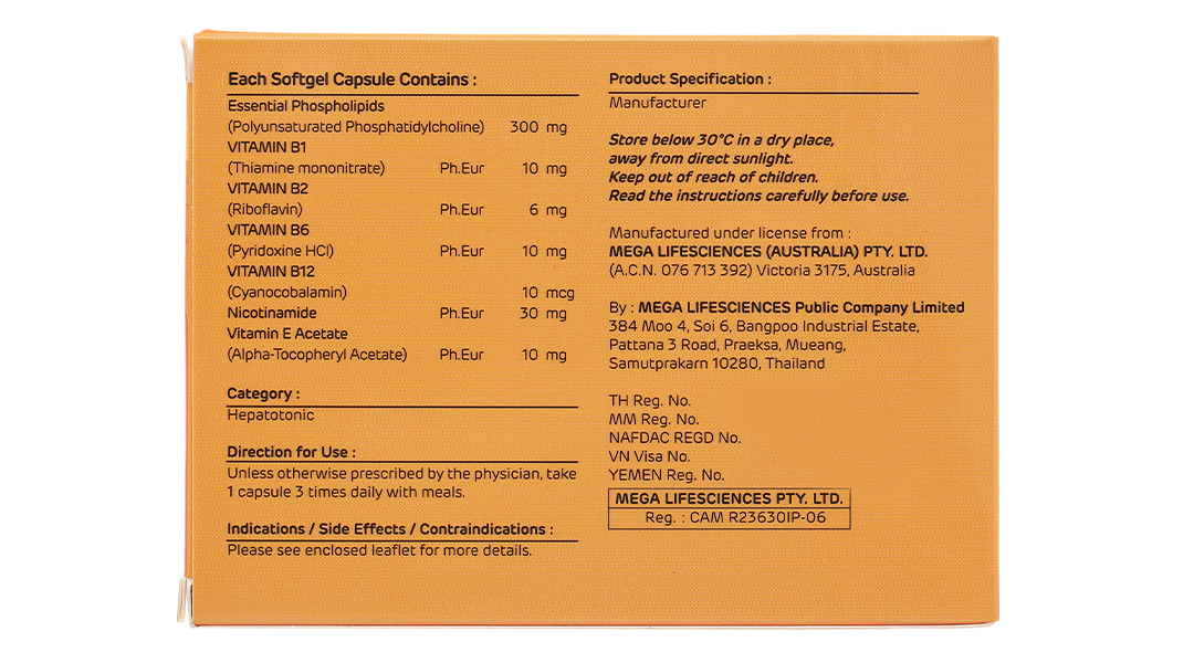Hoạt chất: Phospholipid thiết yếu (Polyunsaturated Phosphatidylcholine) 300 mg, Vitamin B1 (Thiamine mononitrate) 10 mg, Vitamin B2 (Riboflavin) 6 mg, Vitamin B6 (Pyridoxine HCl) 10 mg, Vitamin B12 (Cyanocobalamin) 10 mcg, Niacinamide 30 mg, Vitamin E Acetate (Alpha-Tocopheryl Acetate) 10 mg.