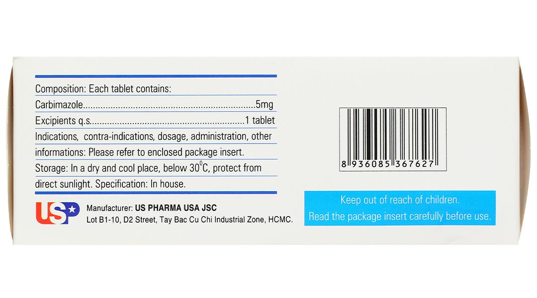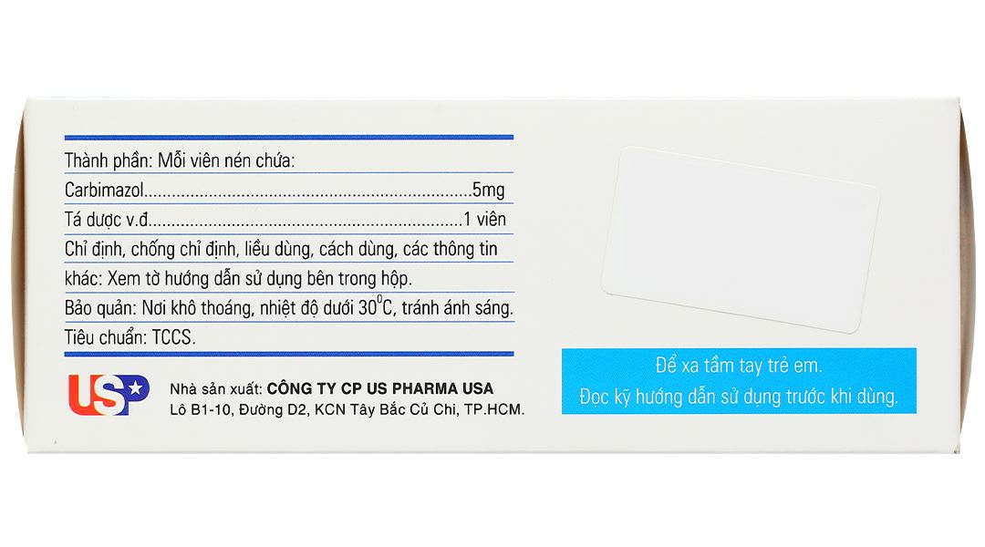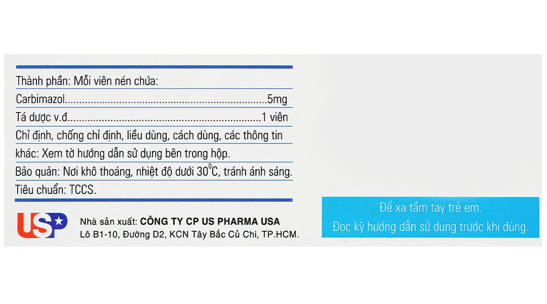 – Thận trọng khi sử dụngPhải có thầy thuốc chuyên khoa chỉ định sử dụng và theo dõi trong suốt quá trình điều trị. Cần theo dõi số lượng bạch cầu và công thức bạch cầu trước khi bắt đầu điều trị, và hàng tuần trong 6 tháng đầu điều trị vì có thể xảy ra suy tủy, giảm bạch cầu nặng, nhất là bệnh nhân cao tuổi hoặc dùng liều từ 40 mg mỗi ngày trở lên. Theo dõi thời gian prothrombin trước và trong quá trình điều trị nếu thấy xuất huyết, đặc biệt là trước phẫu thuật. Phải hết sức thận trọng khi dùng carbimazol cho người đang dùng các thuốc đã biết là dễ gây mất bạch cầu hạt. – Thai kỳ và cho con búPhụ nữ mang thai: Thiamazol, dạng chuyển hoá còn hoạt tính của carbimazol, qua được nhau thai, nên có thể gây hại cho thai nhi (bướu cổ, giảm năng giáp, một số dị tật bẩm sinh), nhưng nguy cơ thực sự thường thấp, đặc biệt khi dùng liều thấp. Cần cân nhắc lợi/hại giữa điều trị và không điều trị. Trong trường hợp phải điều trị propylthiouracil thường được chọn dùng hơn, vì thuốc qua nhau thai ít hơn thiamazol. Khi dùng carbimazol, phải dùng liều thấp nhất có hiệu lực để duy trì chức năng giáp của người mẹ ở mức cao trong giới hạn bình thường của người mang thai bình thường, đặc biệt trong 3 tháng cuối thai kỳ. Giảm năng giáp và bướu cổ ở thai nhi thường xảy ra khi dùng thuốc kháng giáp tới gần ngày sinh, vì tuyến giáp thai nhi chưa sản xuất hormon giáp cho tới tuần thứ 11 hoặc 12 của thai kỳ. Tăng năng giáp có thể giảm ở người mẹ khi thai tiến triển, nên ở một số người có thể giảm liều carbimazol, có khi ngừng điều trị trong 2 – 3 tháng trước khi đẻ. Hormon giáp qua nhau thai rất ít, nên ít có khả năng bảo vệ cho thai nhi. Không nên dùng các hormon giáp trong khi mang thai, vì thuốc có thể che lấp các dấu hiệu thoái lui của cường giáp và tránh được tăng liều carbimazol một cách vô ích, gây thêm tác hại cho mẹ và thai nhi. Phụ nữ cho con bú: Thiamazol là chất chuyển hoá của carbimazol bài tiết được vào sữa mẹ, có thể gây tai biến cho trẻ, vì nồng độ thiamazol trong huyết thanh và sữa mẹ gần bằng nhau. Nếu mẹ cần sử dụng thuốc thì phải dùng liều thấp nhất có tác dụng và phải sau khi uống thuốc được 4 giờ mới cho con bú. Một nghiên cứu dùng liều mỗi ngày 15 mg carbimazol hoặc 10 mg thiamazol hoặc 150 mg propylthiouracil và cho trẻ bú sau khi uống thuốc 4 giờ, chưa thấy tác hại cho trẻ. Chắc chắn hơn, nếu mẹ dùng thuốc thì không cho con bú. – Khả năng lái xe và vận hành máy mócBệnh nhân có thể bị rối loạn thị giác, chóng mặt, hoa mắt, ngủ gà hoặc rối loạn hệ thần kinh trong thời gian dùng carbimazol, do đó cần thận trọng khi lái xe hay vận hành máy móc. – Tương tác thuốcVới aminophylline, oxtriphylline, theophylin, glycosid trợ tim, thuốc chọn beta: Khi cường giáp, sự chuyển hoá các thuốc này tăng lên. Dùng carbimazol, nếu tuyến giáp trở về bình thường, cần giảm liều các thuốc này. Với amiodaron, iod glycerin, iod hoặc KI: Các thuốc có iod làm giảm đáp ứng của cơ thể với carbimazol, vì vậy phải dùng tăng liều carbimazol (amiodaron có 37% iod). Với thuốc chống đông dẫn chất coumarin hoặc indandion: Carbimazol có thể làm giảm prothrombin huyết, nên làm tăng tác dụng của các thuốc chống đông uống. Do đó, cần điều chỉnh liều thuốc chống động dựa vào thời gian prothrombin. Iod phóng xạ 131I: Thuốc kháng giáp có thể làm tuyến giáp giảm hấp thu 131I; hấp thụ 131I có thể tăng trở lại sau khi ngừng đột ngột thuốc kháng giáp 5 ngày. |