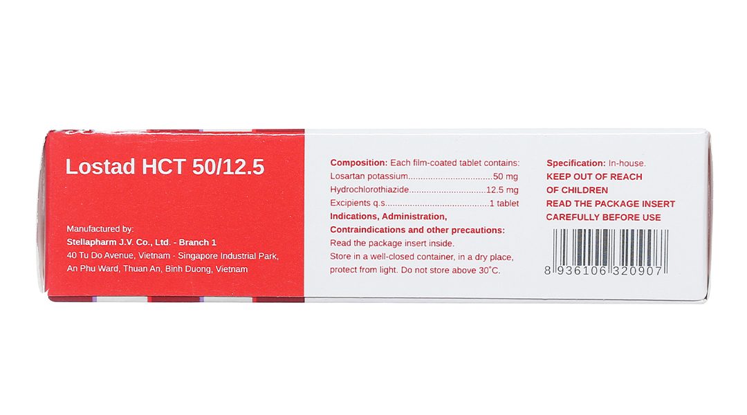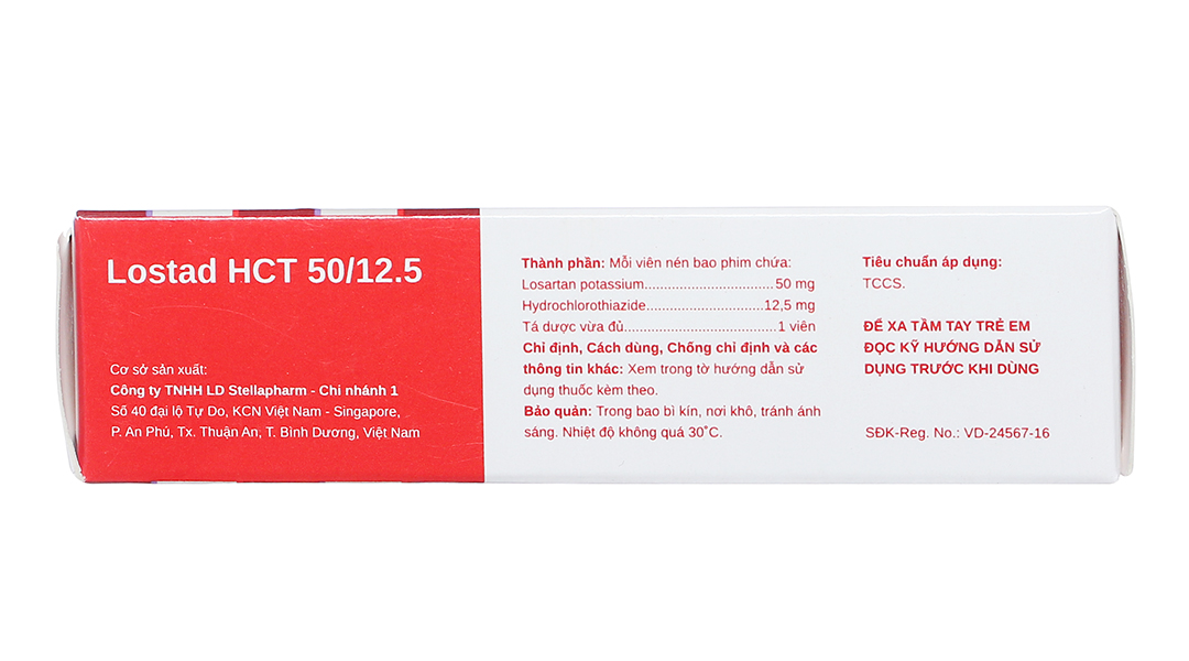 – Thận trọng khi sử dụngThận trọng sử dụng losartan ở bệnh nhân hẹp động mạch thận. Losartan được bài tiết trong nước tiểu và trong ống mật, vì vậy nên giảm liều ở bệnh nhân suy thận và nên cân nhắc dùng cho bệnh nhân suy gan. Bệnh nhân giảm thể tích dịch nội mạch (ví dụ người dùng thuốc lợi tiểu liều cao) có thể xảy ra hạ huyết áp; nên điều chỉnh tình trạng giảm thể tích dịch nội mạch trước khi dùng thuốc, hoặc dùng liều khởi đầu thấp. Do có thể xảy ra tăng kali máu, nên theo dõi nồng độ kali huyết thanh đặc biệt ở người cao tuổi, bệnh nhân suy thận và nên tránh sử dụng đồng thời với các thuốc lợi tiểu giữ kali. Khuyến cáo không dùng Lostad HCT 50/12.5 cho những bệnh nhân suy gan cần phải chỉnh liều losartan. Nên kiểm tra các chất điện giải trong huyết thanh định kỳ vào những thời điểm thích hợp nhằm phát hiện tình trạng mất cân bằng điện giải có thể xảy ra. Tất cả những bệnh nhân đang điều trị với thuốc nhóm thiazid nên được theo dõi các dấu hiệu lâm sàng mất cân bằng dịch hoặc điện giải: Hạ natri huyết, nhiễm kiềm do hạ clo huyết và hạ kali huyết. Nên dùng thận trọng các thiazid ở những bệnh nhân suy chức năng gan hoặc bị bệnh gan tiến triển do những thay đổi nhỏ trong cân bằng dịch và điện giải có thể dẫn đến hôn mê gan. Các phản ứng quá mẫn do hydroclorothiazid có thể xảy ra ở những bệnh nhân có hoặc không có tiền sử dị ứng hoặc hen phế quản, nhưng thường xảy ra hơn ở những bệnh nhân có tiền sử trên. Các thuốc lợi tiểu nhóm thiazid đã được báo cáo là gây tăng hoặc kích hoạt bệnh lupus ban đỏ toàn thân. Liệu pháp thiazid có thể làm giảm dung nạp glucose. Nên điều chỉnh liều thuốc chống đái tháo đường, kể cả insulin. Có thể tăng acid uric huyết hoặc gây cơn gút bộc phát ở một vài bệnh nhân đang dùng liệu pháp thiazid. Vì losartan làm giảm acid uric, losartan phối hợp với hydroclorothiazid làm giảm bớt tình trạng tăng acid uric huyết gây ra do thuốc lợi tiểu. Ở những bệnh nhân đái tháo đường, có thể phải điều chỉnh liều của insulin hoặc các thuốc hạ đường huyết dùng uống. Thuốc lợi tiểu thiazid có thể gây tăng đường huyết. Vì vậy bệnh đái tháo đường tiềm ẩn có thể bộc lộ rõ trong quá trình điều trị với thiazid. Tác dụng hạ huyết áp của thuốc có thể tăng lên ở người bệnh sau khi cắt bỏ thần kinh giao cảm. Thuốc lợi tiểu nhóm thiazid làm tăng sự bài tiết magnesi qua đường tiểu; điều này dẫn đến hạ magnesi huyết. Dùng thuốc lợi tiểu nhóm thiazid có thể gây tăng nồng độ cholesterol và triglycerid. Suy thận: Người suy thận có Clcr ≤ 30 ml/phút không khuyến cáo dùng phối hợp này, do thuốc lợi tiểu nếu phải lựa chọn là lợi tiểu quai. Suy gan: Dạng thuốc phối hợp này không nên dùng trong dò liều cho người suy gan, do phải bắt đầu bằng liều losartan potassium 25mg x 1 lần/ngày. – Thai kỳ và cho con búPhụ nữ có thai Khi sử dụng trong quý hai và quý ba của thai kỳ, các thuốc có tác dụng trực tiếp trên hệ thống renin – angiotensin có thể gay thương tổn, thậm chí gây tử vong cho thai nhi đang phát triển. Ngưng dùng losartan càng sớm càng tốt khi phát hiện có thai. Phụ nữ cho con bú Chưa biết losartan có được bài tiết vào sữa mẹ hay không, nhưng lượng đáng kể losartan và chất chuyển hoá có hoạt tính của thuốc được tìm thấy trong sữa chuột cống. Thuốc lợi tiểu thiazid xuất hiện trong sữa mẹ. Do khả năng có hại cho trẻ đang bú mẹ, cần quyết định ngừng cho bú hoặc ngừng thuốc, có tính đến tầm quan trọng của thuốc đối với người mẹ. – Khả năng lái xe và vận hành máy mócChưa có nghiên cứu về các phản ứng trên khả năng lái xe và vận hành máy móc. Tuy nhiên, khi lái xe hay vận hành máy móc phải chú ý chóng mặt và buồn ngủ đôi khi có thể xảy ra khi điều trị tăng huyết áp, đặc biệt khi bắt đầu điều trị hoặc khi tăng liều. – Tương tác thuốcLosartan Trong các nghiên cứu về tương tác thuốc, không thấy có sự tương tác dược động đáng kể giữa losartan với hydroclorothiazid, digoxin, warfarin. Cimetidin làm tăng AUC của losartan trong máu, nhưng không ảnh hưởng tới chất chuyển hóa. Phenobarbital làm giảm AUC của losartan. Lithi: Tương tác làm giảm đào thải lithi, vì vậy phải theo dõi nồng độ lithi trong máu. Rifampin, một tác nhân cảm ứng chuyển hóa thuốc, làm giảm nồng độ losartan và chất chuyển hóa có hoạt tính. Fluconazol, một thuốc ức chế P450 2C9, làm giảm nồng độ chất chuyển hóa có hoạt tính và làm tăng nồng độ losartan. Giống như các thuốc chẹn angiotensin II hoặc chẹn tác dụng của nó, nếu sử dụng đồng thời với thuốc lợi tiểu giữ kali (như spironolacton, triamteren, amilorid), với thuốc bổ sung kali, hoặc với các chất thay thế muối có chứa kali thì có thể dẫn đến tăng kali huyết thanh. Cũng như các thuốc trị tăng huyết áp khác, hiệu quả chống tăng huyết áp của losartan có thể bị