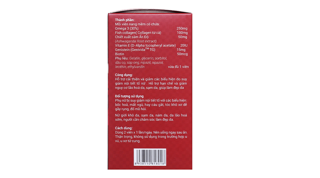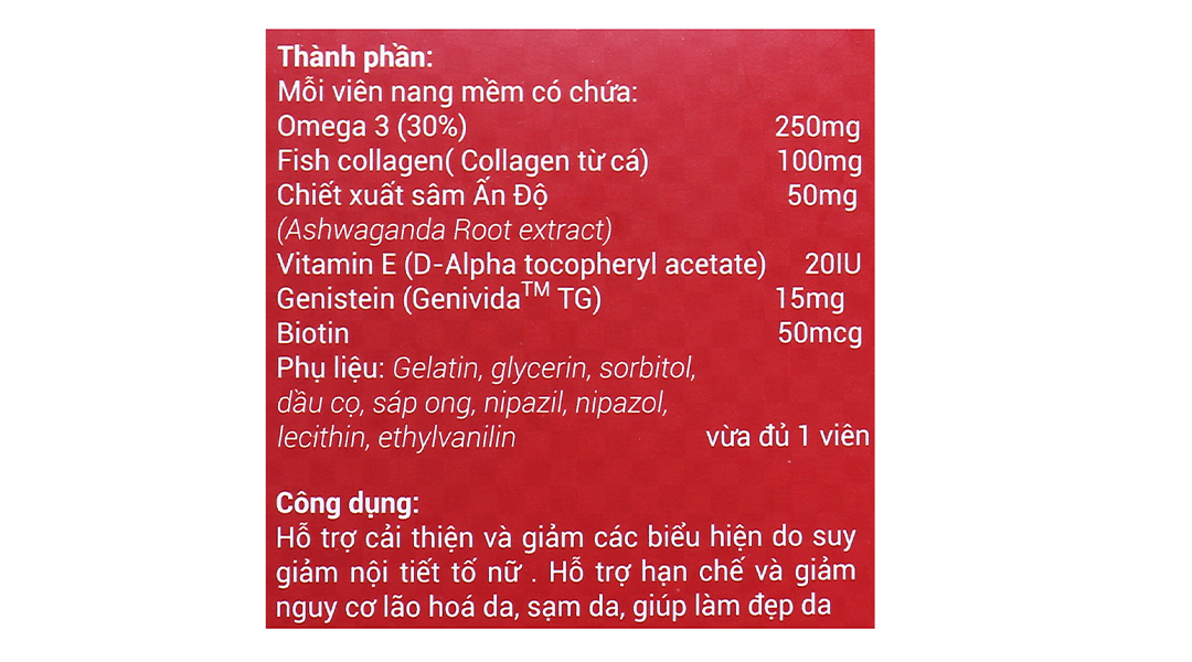 Omega 3 (30%) 250mg, Fish collagen (Collagen từ cá) 100mg, Chiết xuất sâm Ấn Độ 50mg (Ashwagandha Root extract), Vitamin E (D-Alpha tocopheryl acetate) 20IU, Genistein (Genivida™ TG) 15mg, Biotin 50mcg.