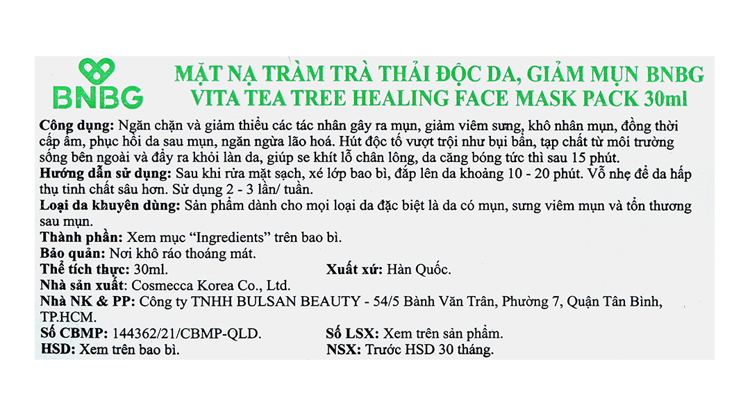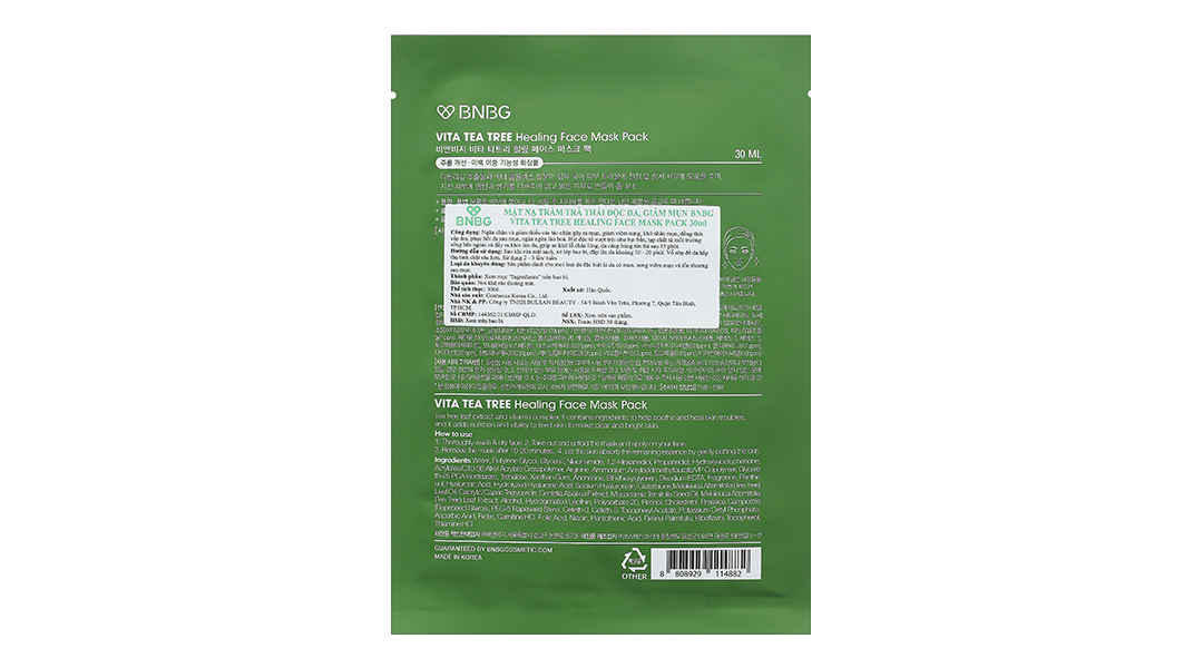 Mặt nạ thải độc da, giảm mụn chiết xuất tràm trà BNBG Vita Tea Tree Healing Face Mask Pack chứa: