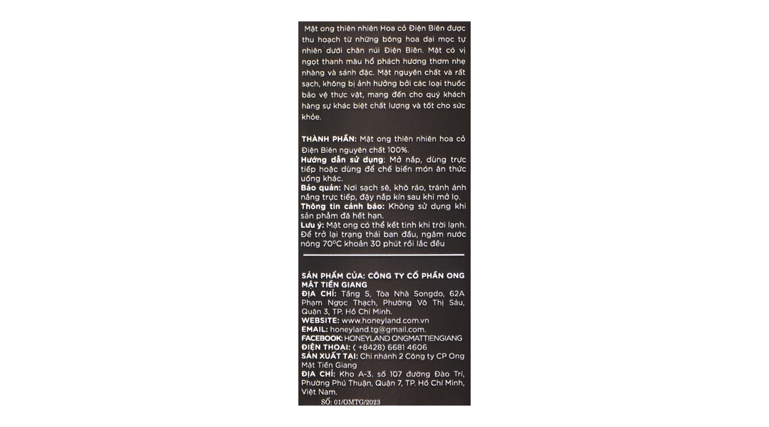 Mật ong Honeyland có thể kết tinh khi trời lạnh. Để trở lại trạng thái ban đầu, ngâm nước nóng 70°C khoảng 30 phút rồi lắc đều.