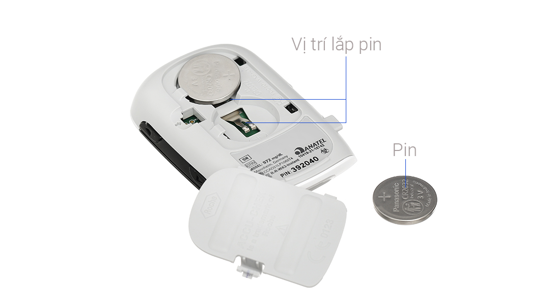 Máy đo sử dụng hai pin lithium 3 vôn, loại đồng xu CR2032. Tuổi thọ pin có thể khác nhau tùy theo các yếu tố như nhiệt độ và hãng sản xuất pin.