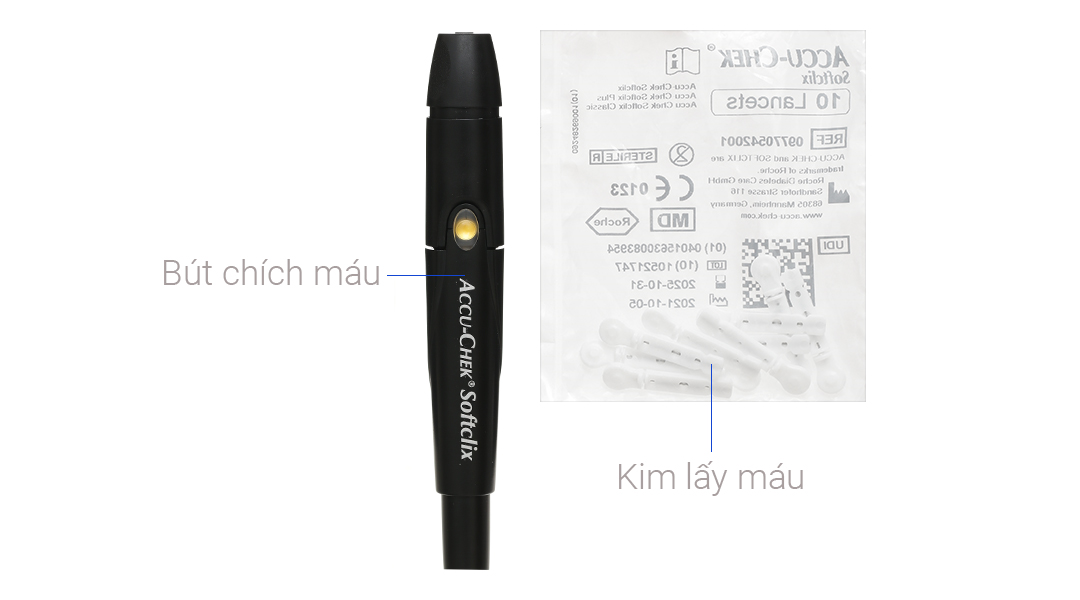 - Tiện ích: Lấy máu hầu như không đau với thiết bị lấy máu ACCU-CHEK® SoftClix. Nút bấm loại bỏ que thử đã sử dụng, đảm bảo an toàn và vệ sinh.
