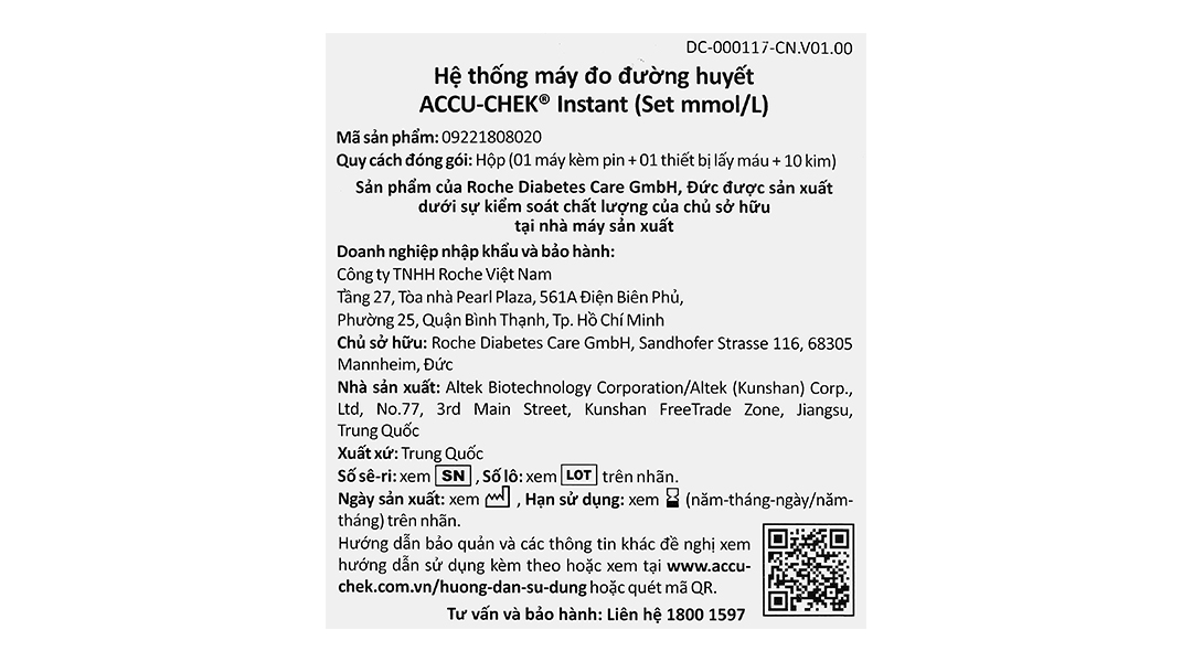 - Loại máy: Máy đo đường huyết Accu-Chek® Instant thích hợp để sử dụng liên tục.