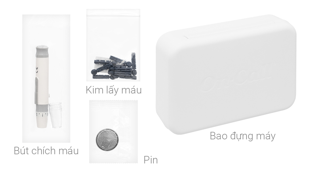 Hộp sản phẩm bao gồm: Máy đo đường huyết kèm pin, bút lấy máu, kim lấy máu, hộp đựng máy, tờ HDSD.