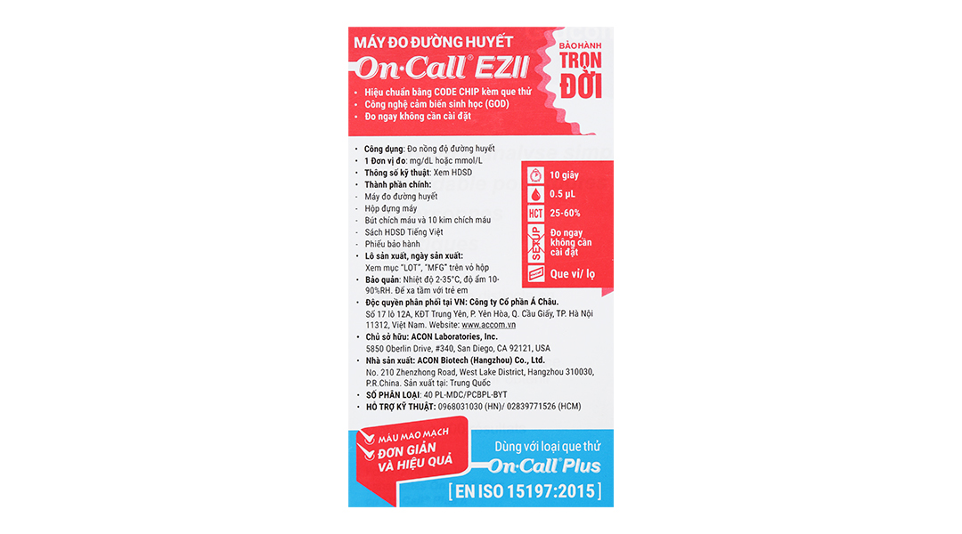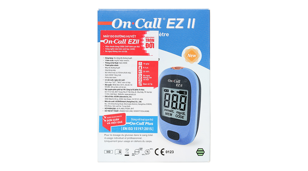 - Máy đo đường huyết On Call EZ II được sản xuất bởi công ty ACON Laboratories – đơn vị có trụ sở chính ở San Diego (Mỹ) sản xuất. ACON nổi tiếng ở hơn 130 quốc gia trong lĩnh vực y tế với 23 năm dẫn đầu trong việc nghiên cứu, sản xuất các dụng cụ chẩn đoán và thiết bị y tế chất lượng cao.