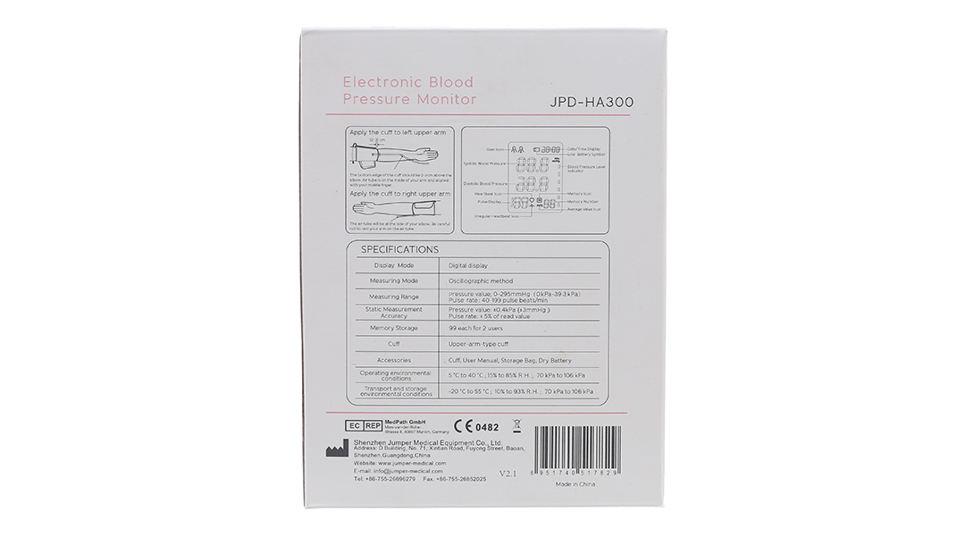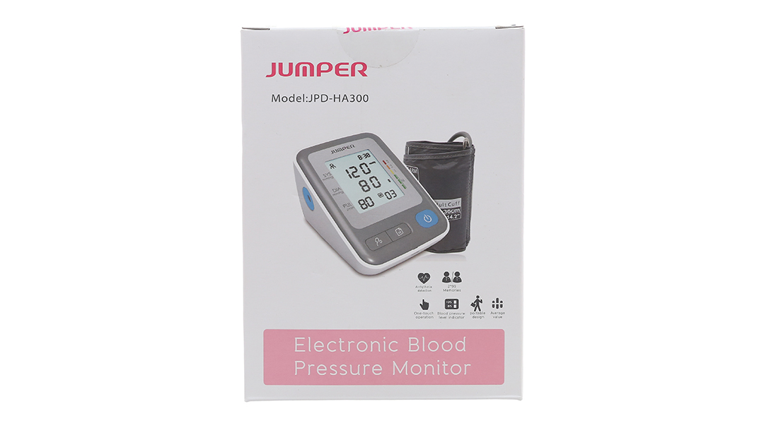 Máy đo huyết áp bắp tay JPD-HA300 tự đông đo với thao tác sử dụng đơn giản chỉ với một nút bấm; kết quả đo bao gồm huyết áp và nhịp tim sẽ được hiển thị rõ ràng trên màn hình LED cực kỳ thuận tiện cho người sử dụng. Đồng thời, máy đo huyết áp Jumper được trang bị sẵn cảnh báo huyết áp và nhịp tim bất thường theo thang đo tiêu chuẩn của WHO giúp phát hiện sớm các bệnh tim mạch.