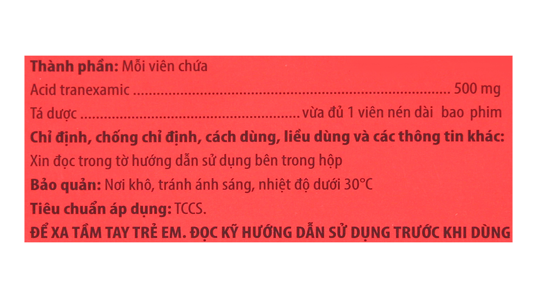 Những triệu chứng quá liều có thể là: buồn nôn, nôn, các triệu chứng và/hoặc hạ huyết áp tư thế đứng. Không có biện pháp đặc biệt để điều trị nhiễm độc acid tranexamic. Nếu nhiễm độc do uống quá liều có thể gây nôn, rửa dạ dày, và dùng than hoạt. Trong cả 2 trường hợp nhiễm độc do uống hoặc do tiêm truyền, nên duy trì bổ sung dịch để thúc đẩy thuốc bài tiết qua thận và dùng các biện pháp điều trị triệu chứng và điều trị hỗ trợ.