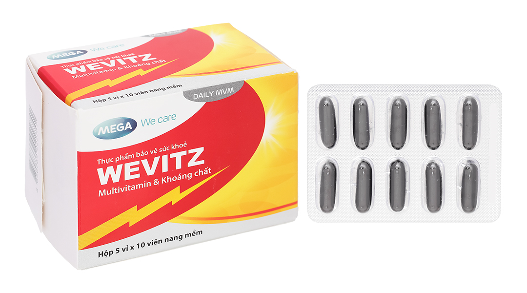 - Wevitz là sản phẩm giúp bổ sung đầy đủ các vitamin và khoáng chất thiết yếu cho cơ thể. Mỗi viên nang mềm Wevitz chứa Vitamin A (giúp duy trì thị lực), Vitamin D3 (hỗ trợ hệ xương và miễn dịch), Vitamin C (tăng cường sức đề kháng), các vitamin nhóm B (hỗ trợ trao đổi chất và năng lượng), cùng các khoáng chất thiết yếu như Sắt, Kẽm, Magiê, và Canxi, Wevitz không chỉ giúp bổ sung dinh dưỡng mà còn giúp cải thiện sức khỏe, hỗ trợ sự phát triển của cơ thể, giảm mệt mỏi, và phục hồi nhanh chóng sau bệnh tật.