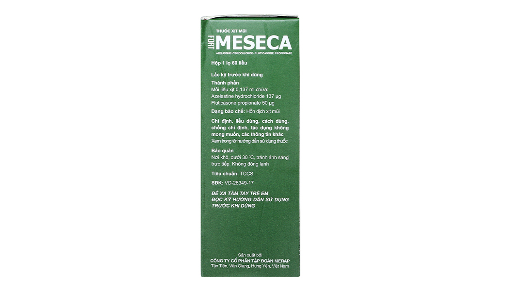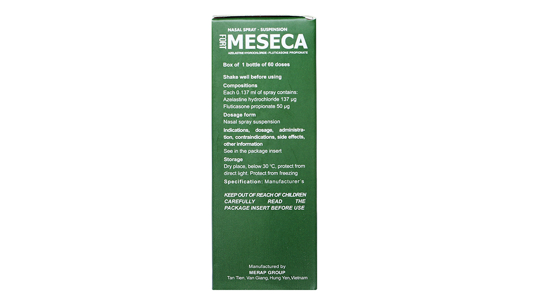 - MESECA FORT chứa azelastine hydrocortisone và fluticasone propionate. Mỗi thành phần có cơ chế tác dụng khác nhau và tạo tác dụng hiệp đồng để cải thiện các triệu chứng của viêm mũi và viêm giác mạc dị ứng