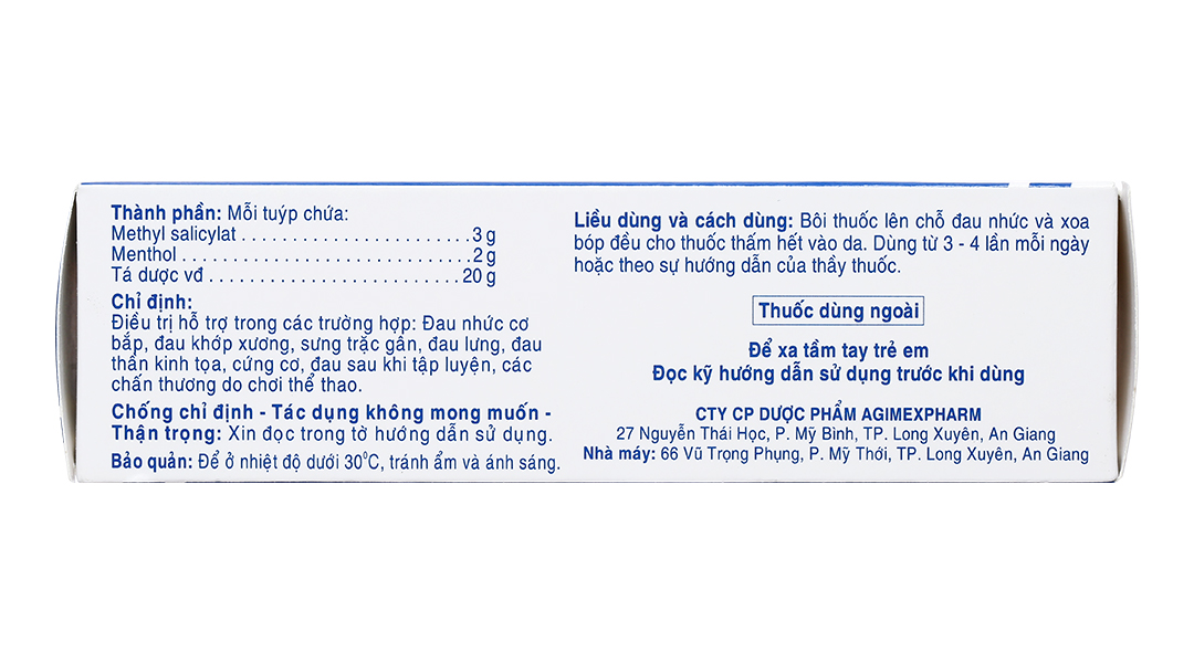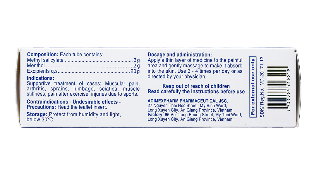 Bôi thuốc lên chỗ đau nhức và xoa bóp đều cho thuốc thấm hết vào da. Dùng từ 3 – 4 lần mỗi ngày hoặc theo sự hướng dẫn của thầy thuốc.