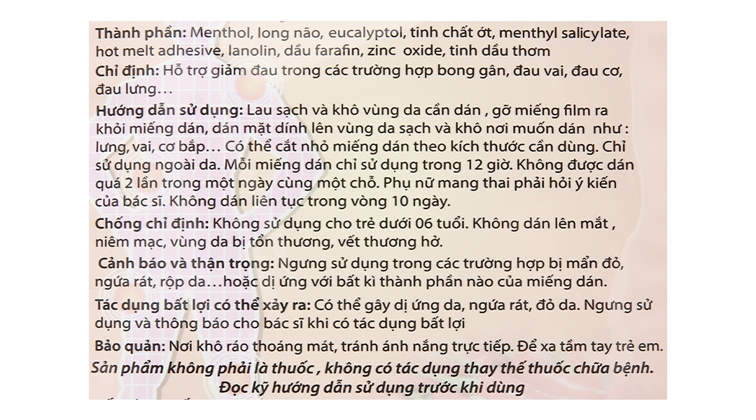 Thành phầnMenthol, long não, eucalyptol, tinh chất ớt, menthyl salicylate, hot melt adhesive, lanolin, dầu farafin, zinc oxide, tinh dầu thơm