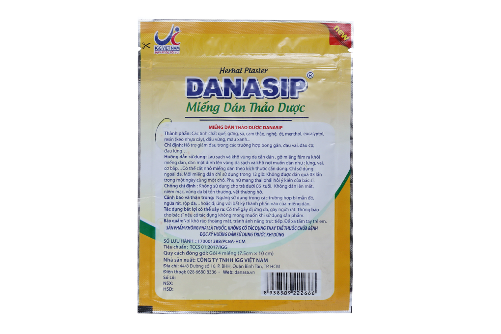 Miếng dán thảo dược Danasip hỗ trợ giảm đau trong các trường hợp bong gân, đau vai, đau cơ, đau lưng.
