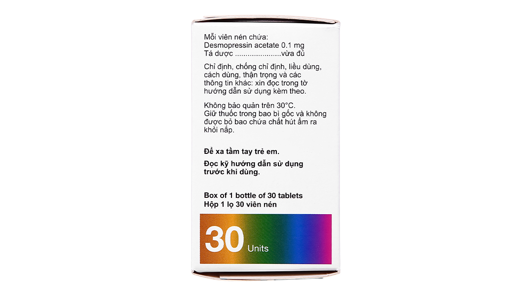 - Khi được sử dụng trong các chỉ định đái dầm ban đêm tiên phát và tiểu đêm, sự thu nhận dịch phải được hạn chế đến mức thấp nhất từ 1 giờ trước khi dùng thuốc cho đến sáng hôm sau (ít nhất là 8 giờ) sau khi dùng thuốc. Việc điều trị không kết hợp giảm thu nhận dịch có thể dẫn đến ứ dịch và/hoặc giảm natri huyết, có hoặc không có các dấu hiệu và triệu chứng cảnh báo kèm theo (nhức đầu, buồn nôn/nôn, tăng cân và co giật trong những trường hợp nặng).